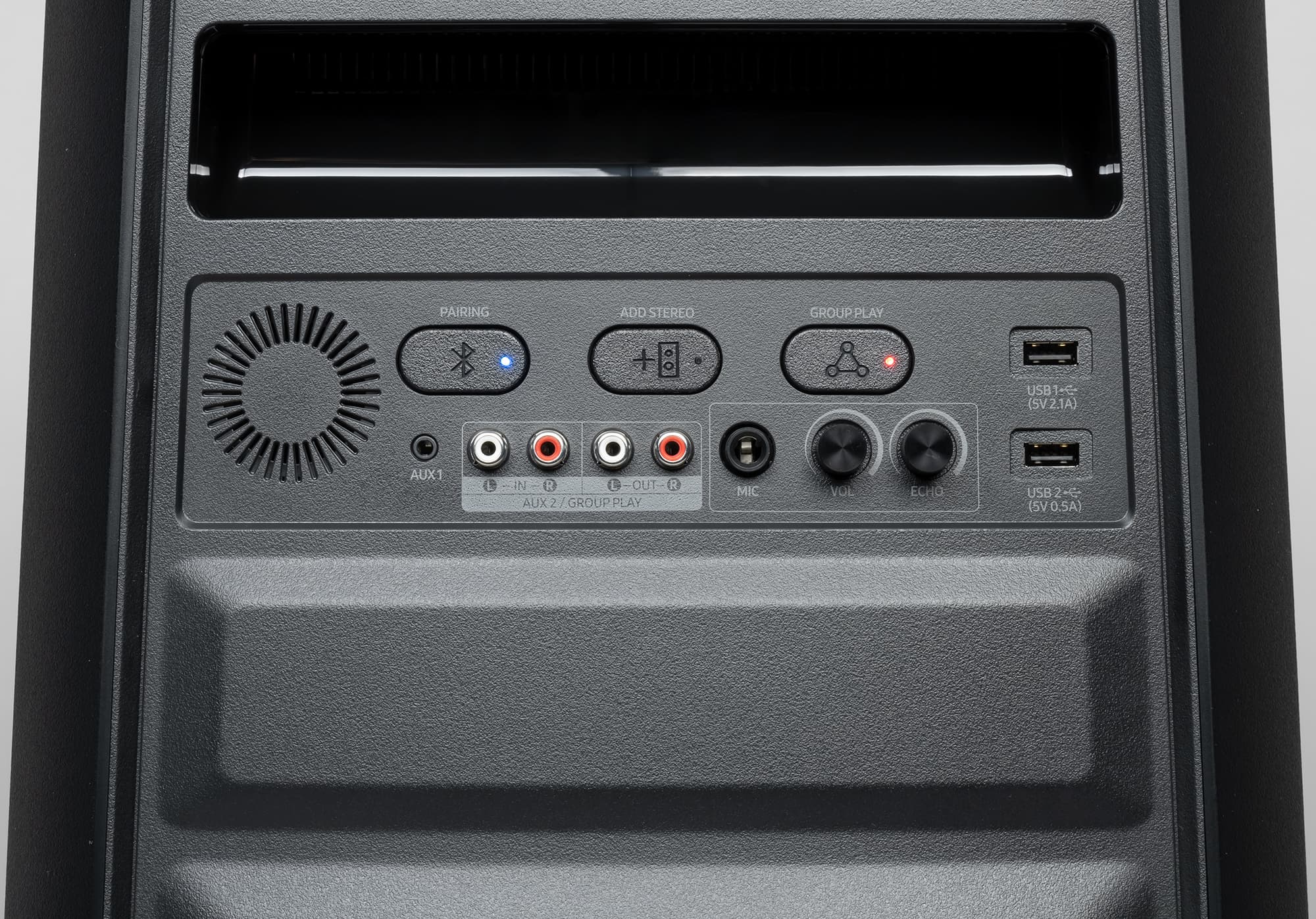 Вариантов подключения к источнику у Samsung Giga Party несколько, начнем с потенциально самого востребованного — посредством Bluetooth. Режим сопряжения активируется с помощью кнопки Pairing на ПДУ или задней панели. Далее все как обычно: находим колонку в соответствующем меню гаджета и подключаем.