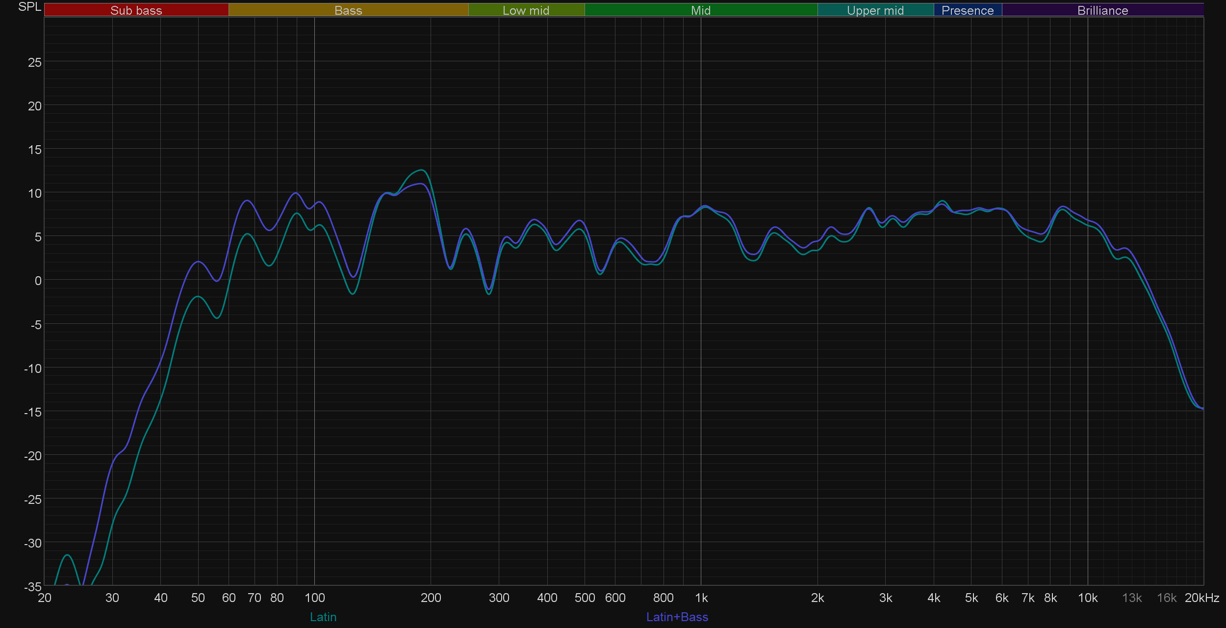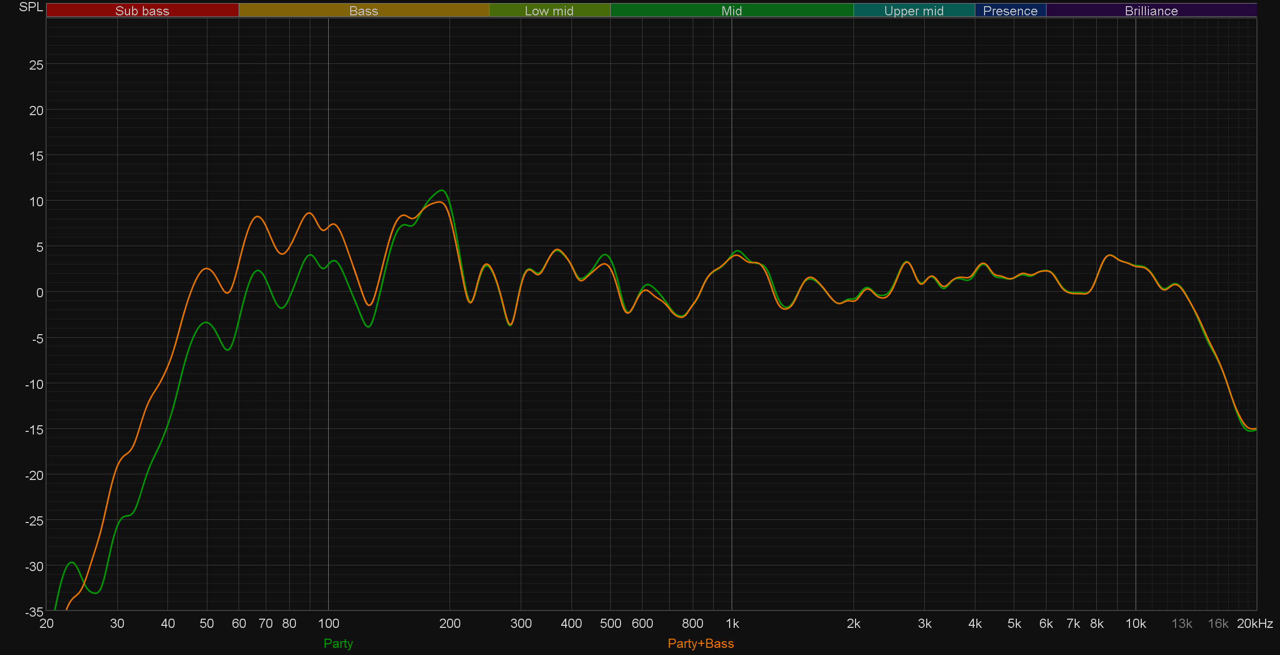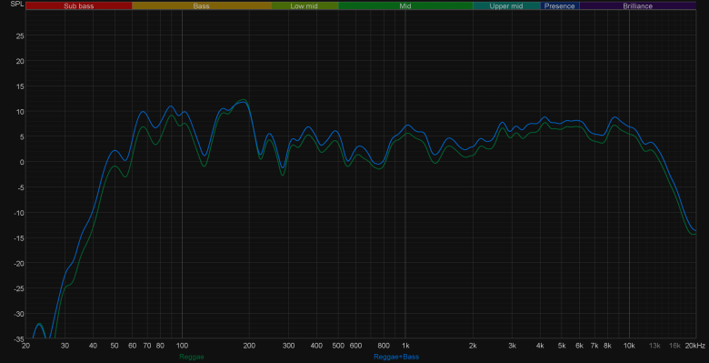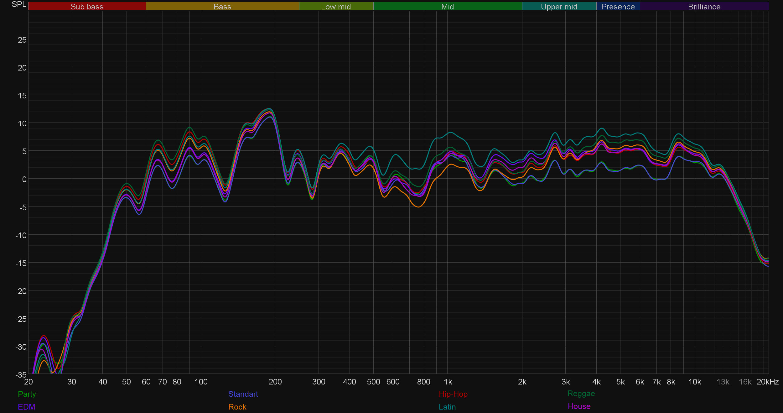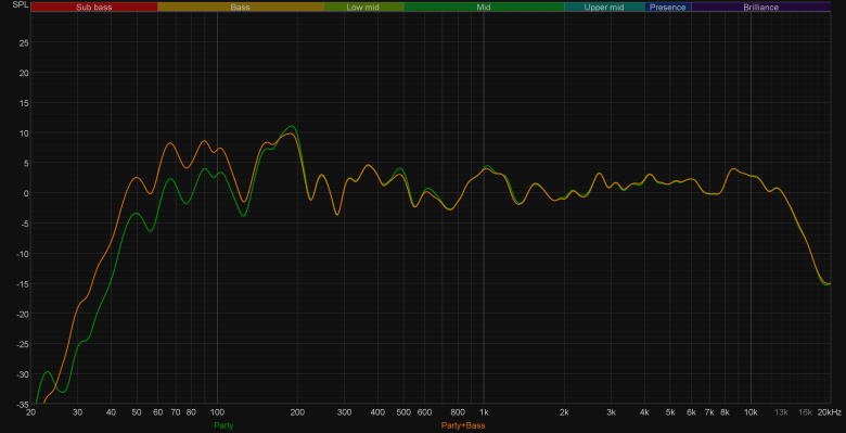 Ну и, конечно, сравним АЧХ при активации различных пресетов эквалайзера. Как можно заметить, работают они довольно деликатно. При этом режимы Party и Standard практически не отличаются, действие остальных вполне можно предсказать, исходя из их названия. Выделить здесь стоит лишь режим Latin, в котором довольно основательно подчеркивается середина — зачастую это звучит довольно интересно.