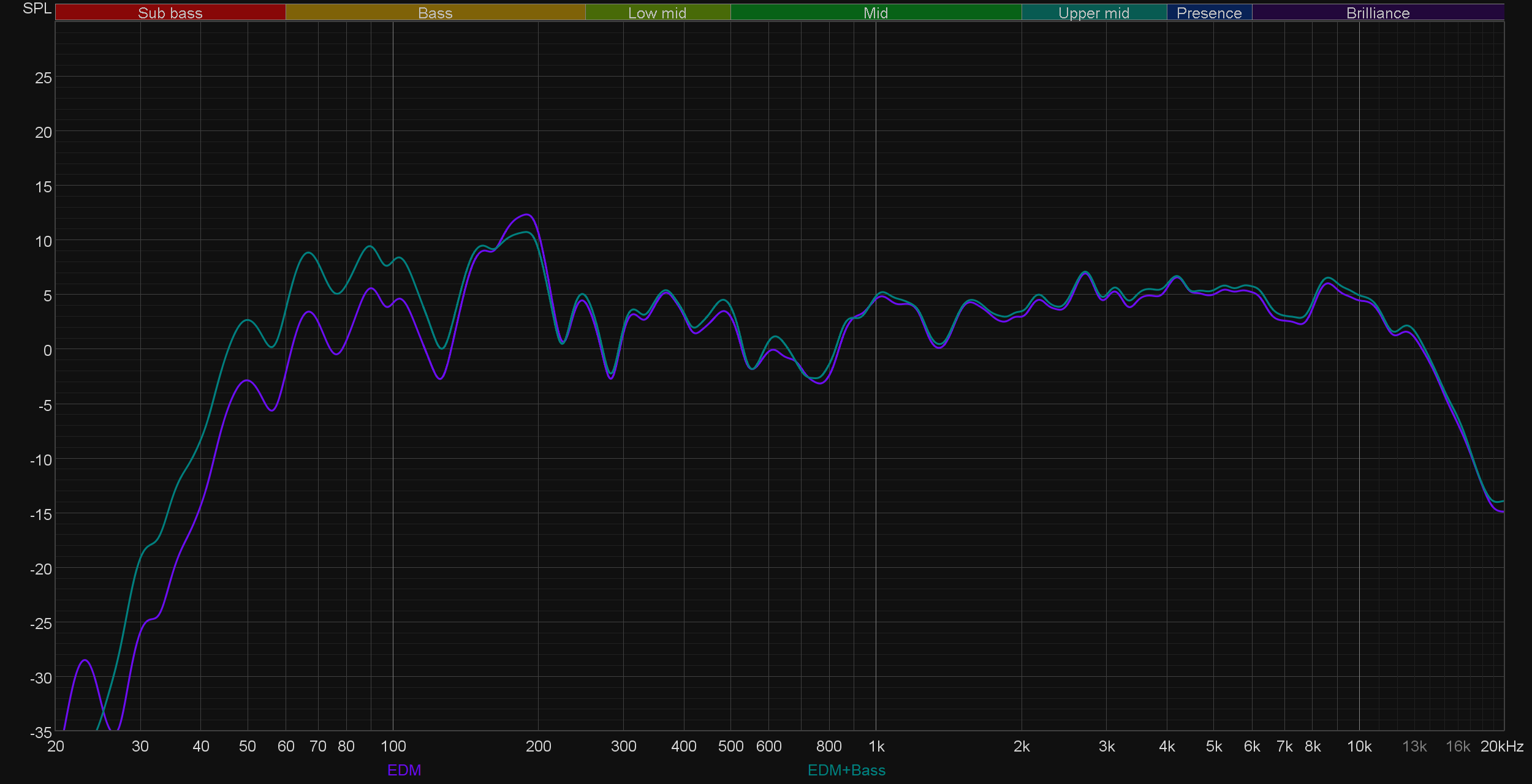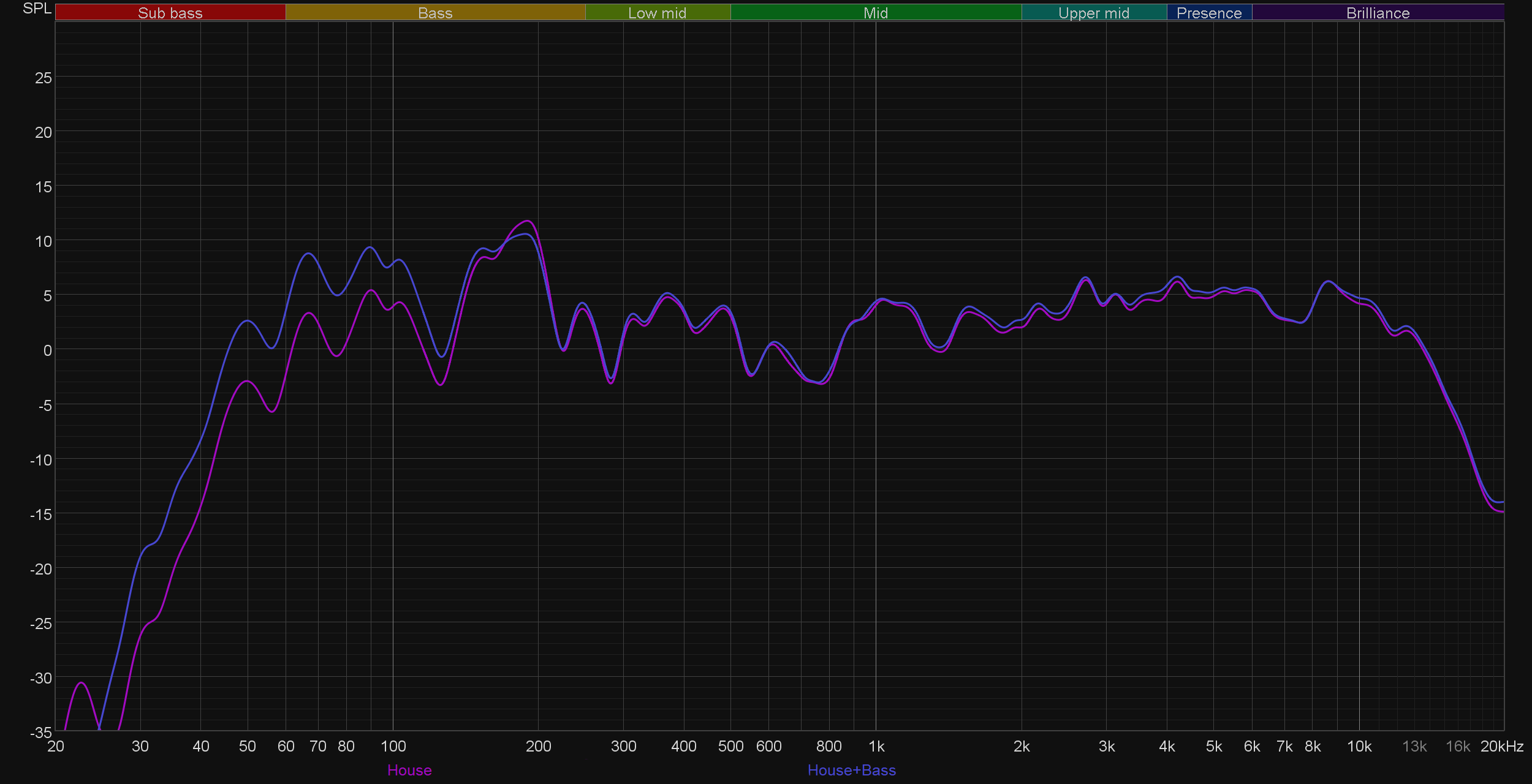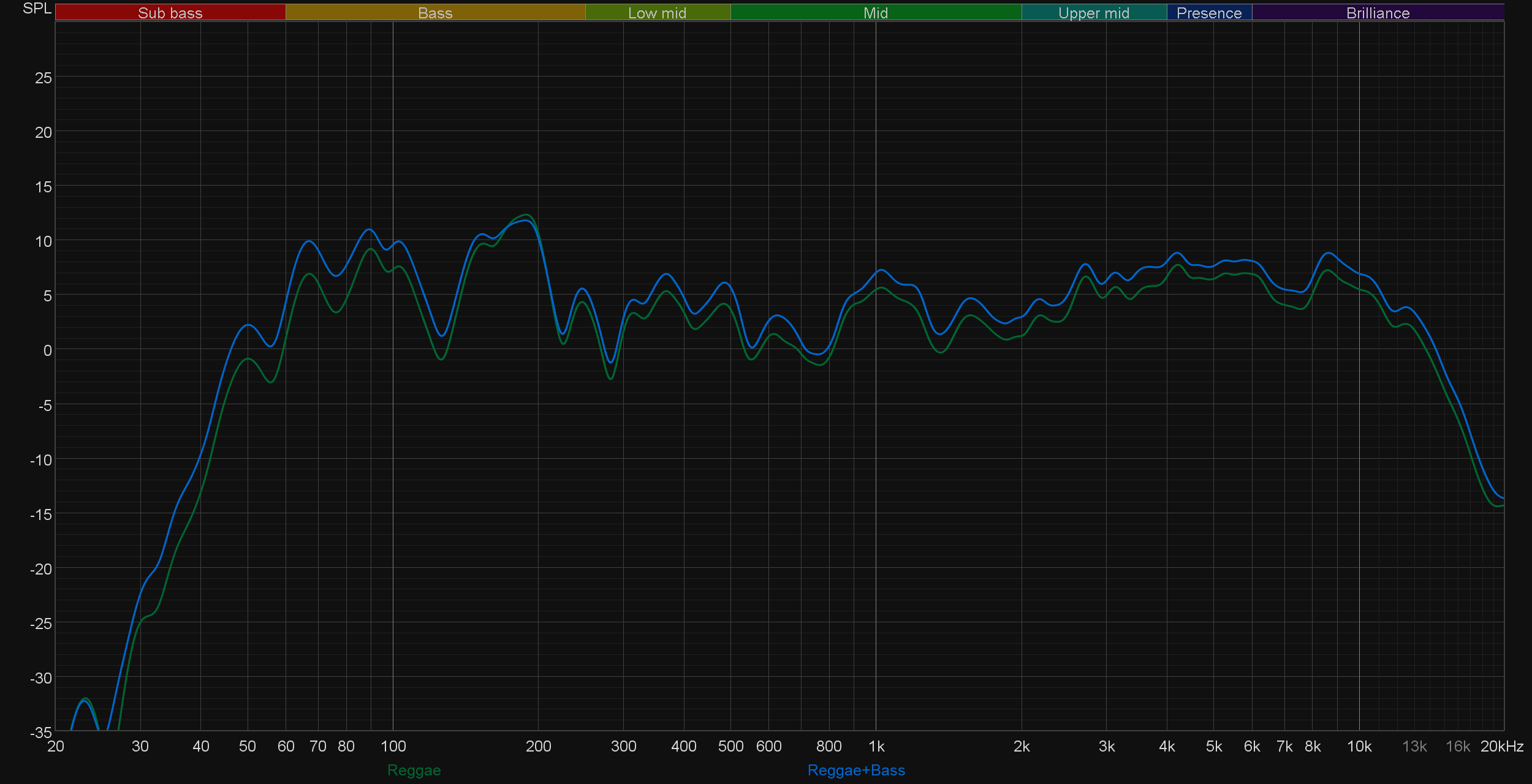 Ну и, конечно, сравним АЧХ при активации различных пресетов эквалайзера. Как можно заметить, работают они довольно деликатно. При этом режимы Party и Standard практически не отличаются, действие остальных вполне можно предсказать, исходя из их названия. Выделить здесь стоит лишь режим Latin, в котором довольно основательно подчеркивается середина — зачастую это звучит довольно интересно.