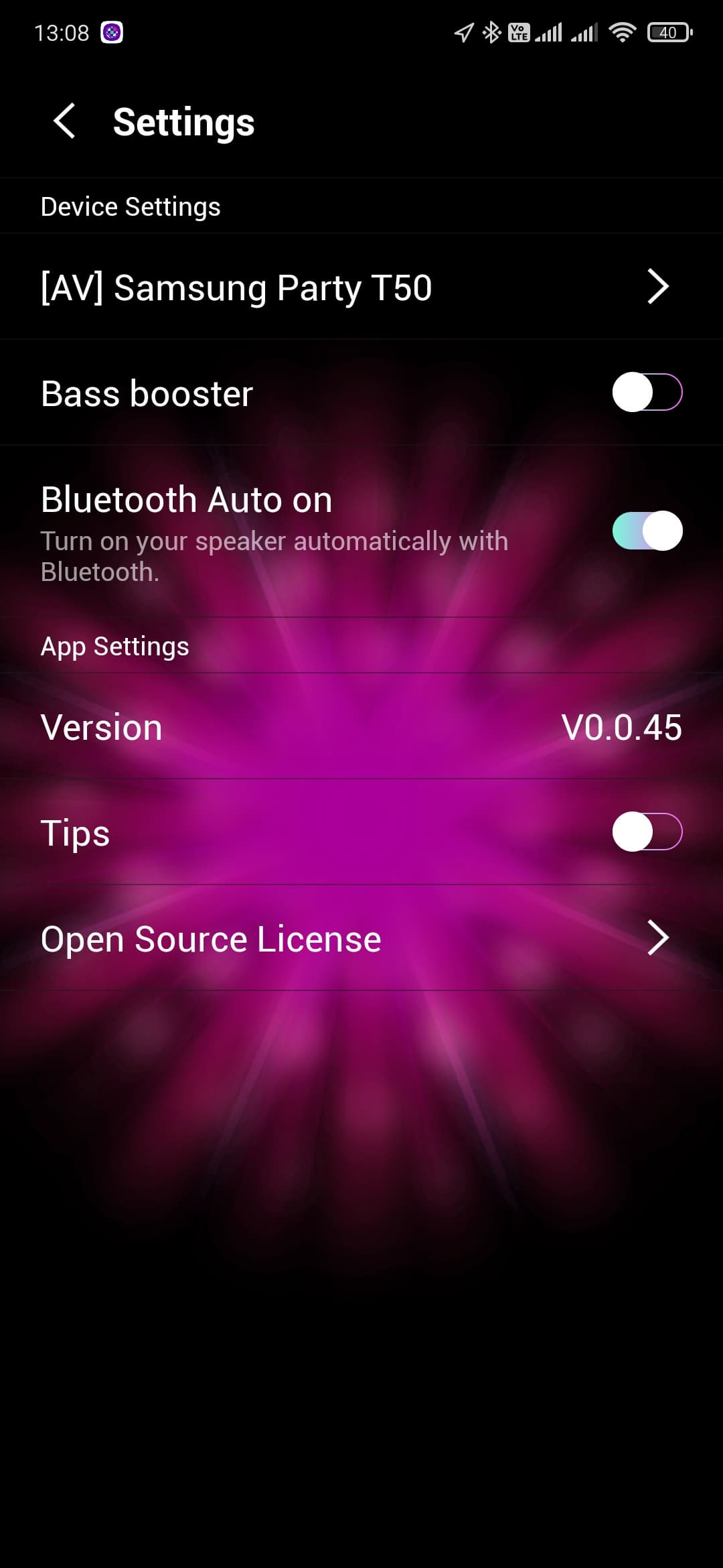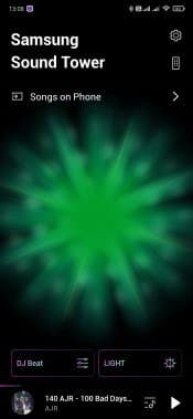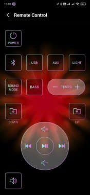 Но даже это еще не все. Управлять колонкой также можно с помощью приложения Samsung Giga Party Audio, доступного для устройств под управлением Android и iOS. После установки оно некоторое время «ищет» подключенные устройства, после чего пользователь оказывается на главном экране, где собраны кнопки различные кнопки, а также размещен небольшой виджет встроенного плеера. На странице настроек можно включить или выключить функцию усиления баса, активировать включение при соединении с Bluetooth-источником, а также узнать версию ПО. По нажатию иконки в правом верхнем углу доступна сокращенная версия пульта дистанционного управления, куда вынесены кнопки управления основными функциями.