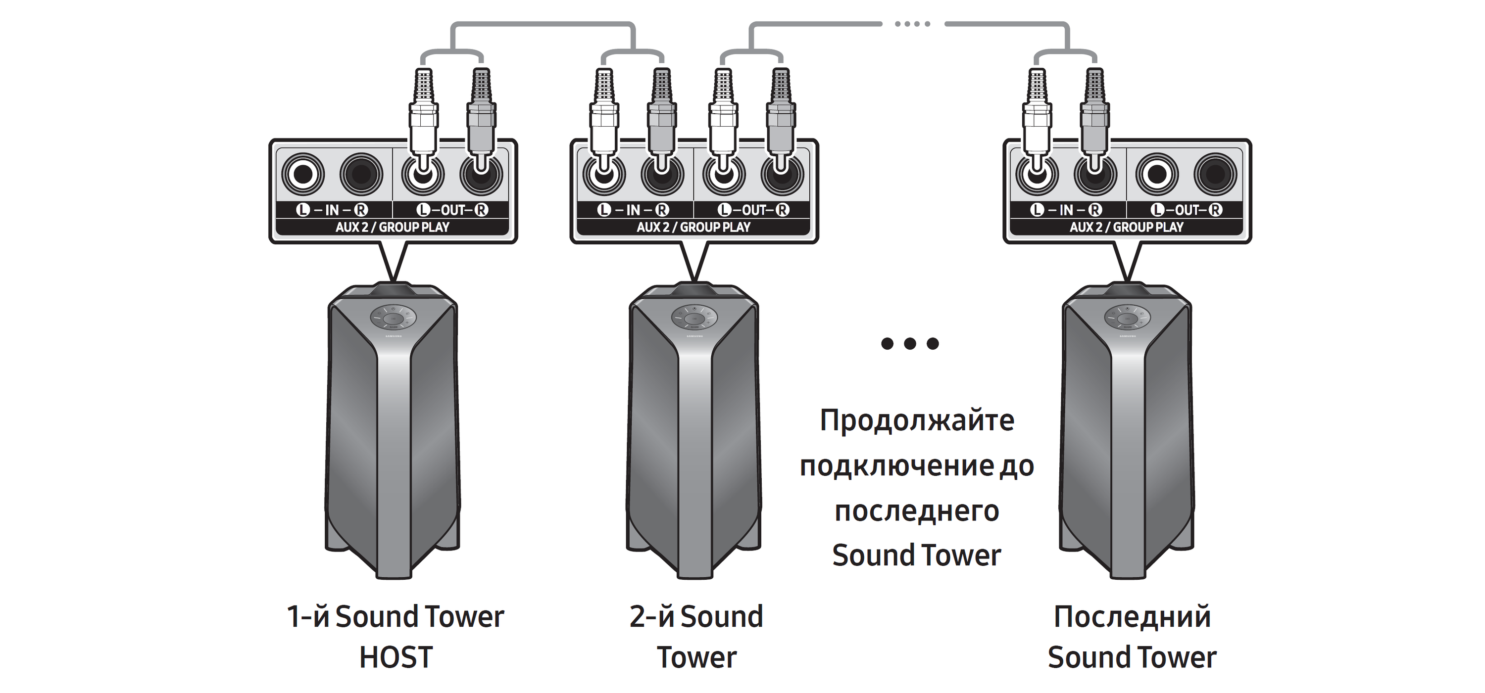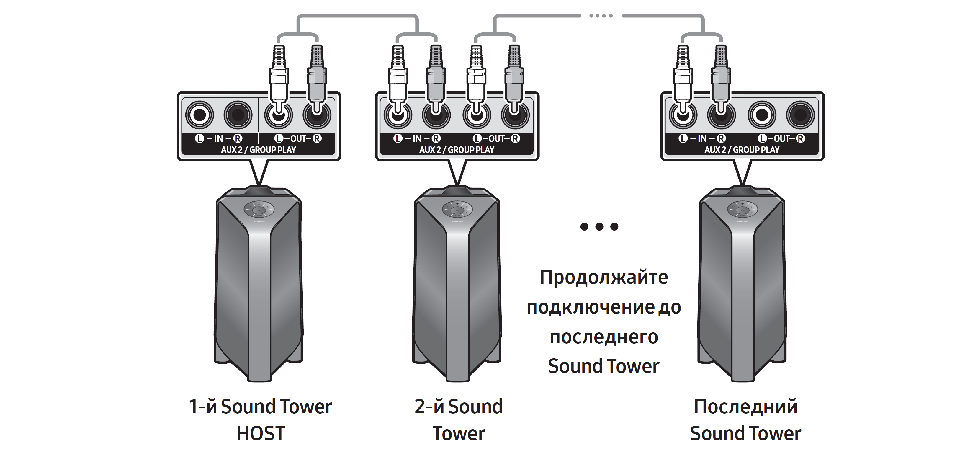 У каждой из колонок есть вход и выход, соответственно — то же самое можно реализовать и в проводном режиме. В одну колонку подаем сигнал, к ее выходу подключаем следующую, потом еще одну — и так далее по цепочке.