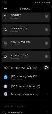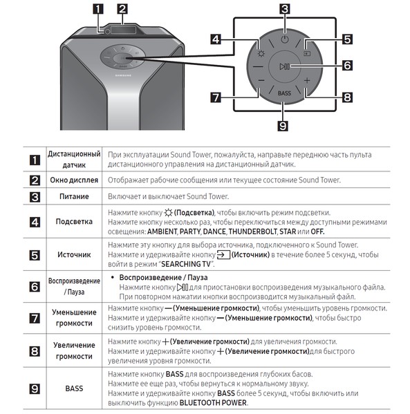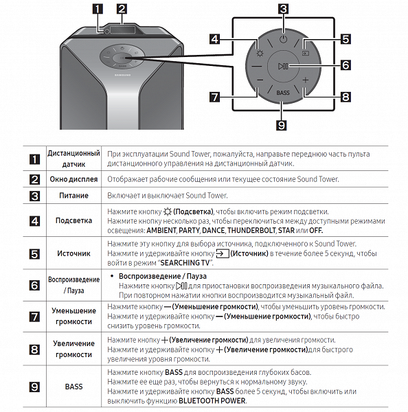 Среди интересных возможностей надо отметить режим включения питания при беспроводном присоединении источника. Колонка умеет уходить в спящий режим, оставляя доступным Bluetooth-модуль. Как только происходит подключение источника — вновь задействуются усилитель, подсветка и так далее. Включается функция с помощью длительного нажатия кнопки BASS на передней панели или из приложения — об этом мы еще подробно поговорим отдельно. Также возможно подключение к телевизорам от Samsung, не только позволяющее транслировать звук на аудиосистему, но и дающее ряд дополнительных возможностей по совместному управлению устройствами.