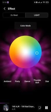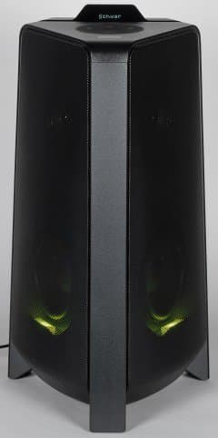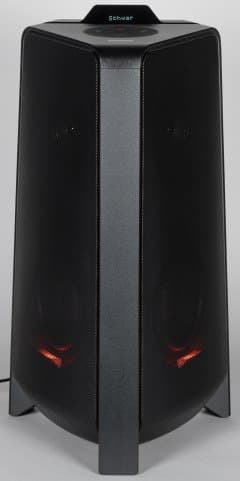 Аудиосистема, конечно, портативная. Но все-таки габаритная — 35×65×32 см, да и весит 11,6 кг. Аккумулятора при этом нет, то есть использовать ее на свежем воздухе не очень-то и получится — скорее, речь идет про вечеринки в загородном доме, например. Подсветка не самая впечатляющая, что нам доводилось видеть — подсвечивается только динамик снизу. Зато она яркая и в динамическом режиме довольно убедительно попадает в ритм звучащей мелодии. Режимов, кстати, целых пять: Party (Вечеринка), Ambient (Окружение), Dance (Танцы), Thunderbolt (Молния), Star (Звезда). Названия, надо сказать, довольно условные. Но выбрать есть из чего.