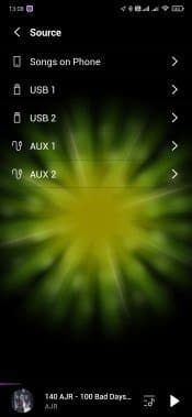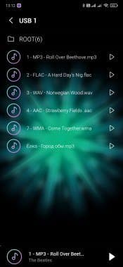 На вкладке Source можно выбрать источник звука. В частности, можно воспользоваться встроенным плеером. Обилием возможностей он не блещет — в частности, вместо тегов в списке демонстрируются названия файлов, что сильно ограничивает возможности сортировки и создания библиотеки. Что интересно, со смартфона можно управлять и воспроизведением с USB-накопителя, причем приложение даже отображает имена файлов.