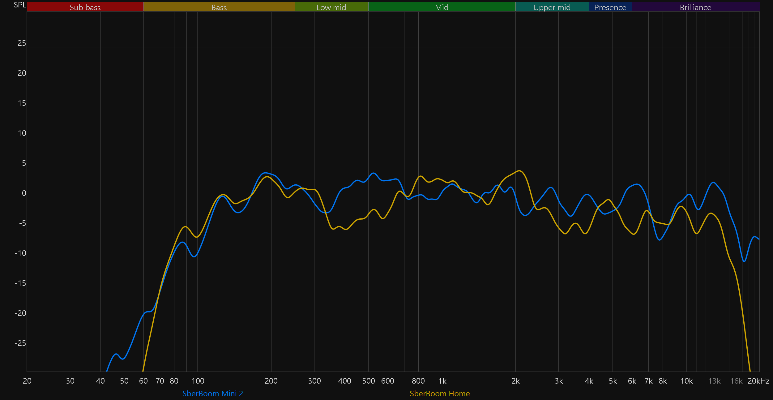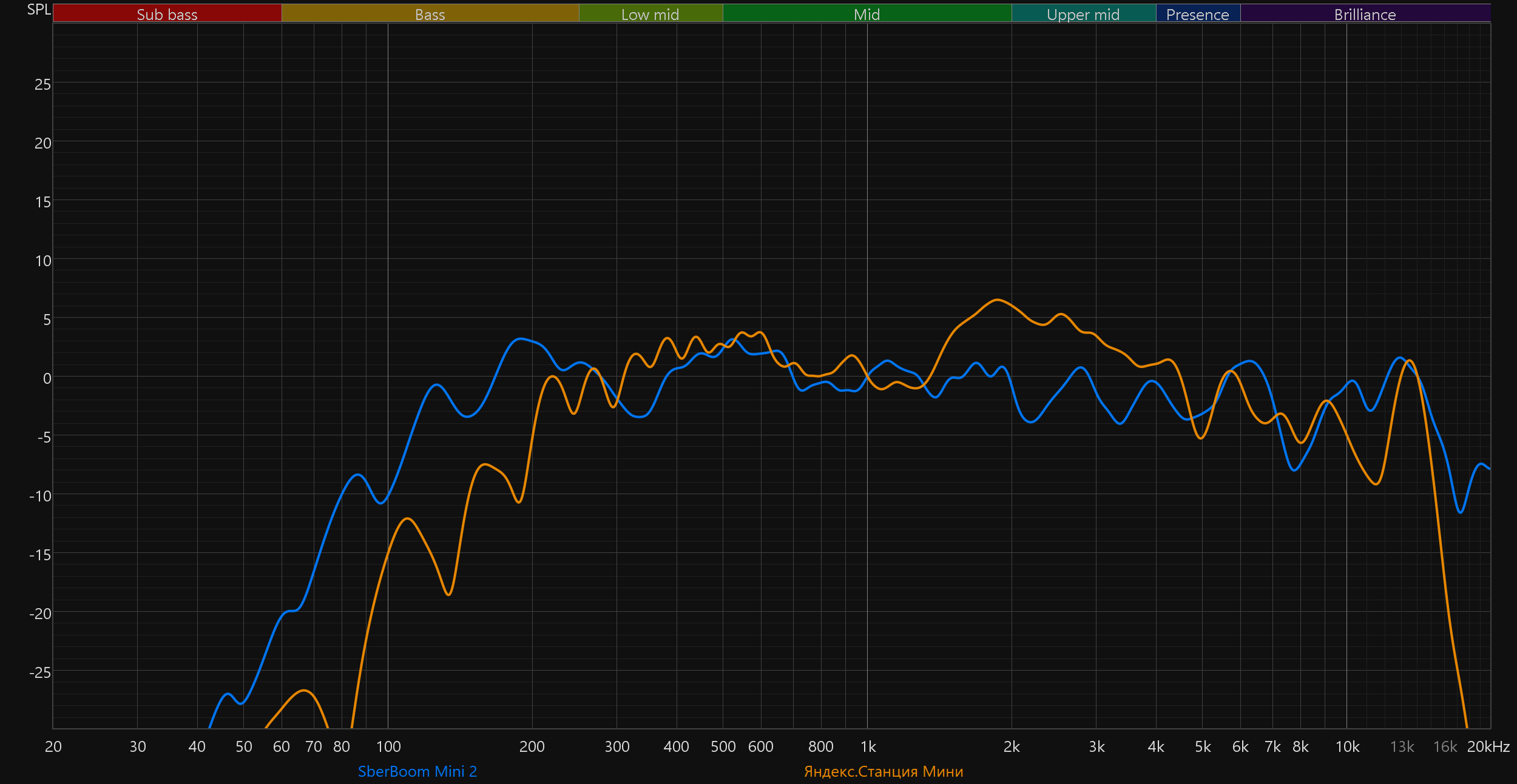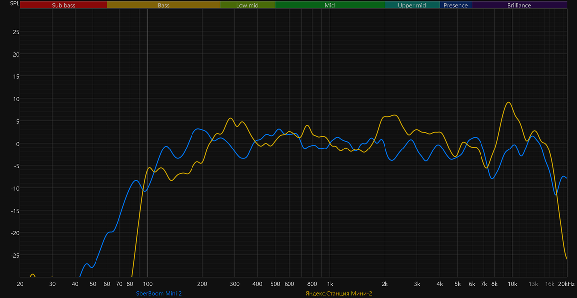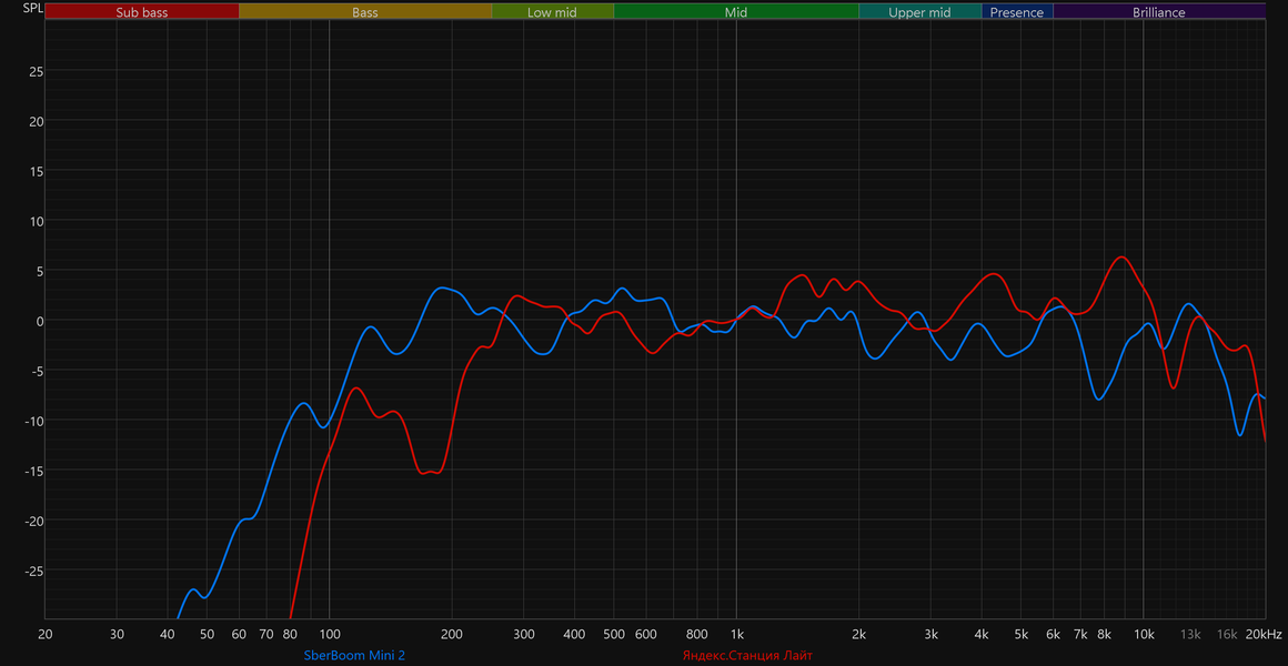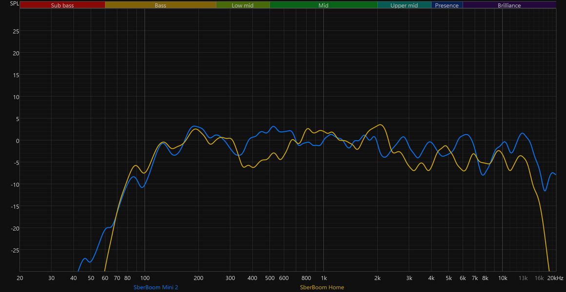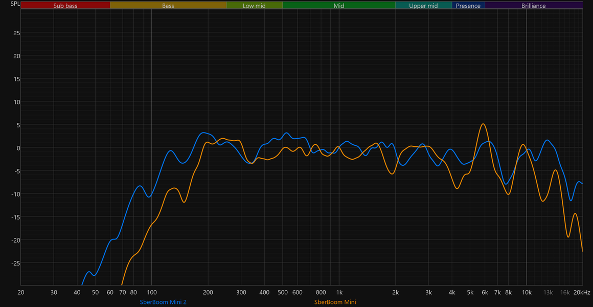 Самое интересное здесь — это, конечно, сравнение новой версии SberBoom Mini со старой. Прогресс налицо — улучшилось воспроизведение НЧ-диапазона, стала более равномерной середина, меньше «изрезан» ВЧ-регистр.