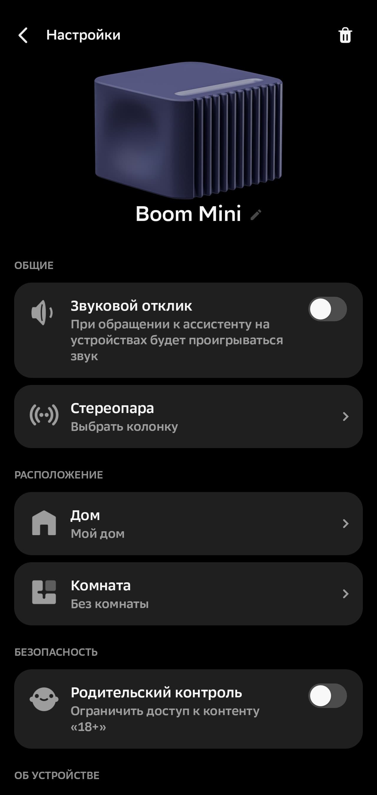 Мы тестировали колонку до ее официального выхода, а также пользовались бета-версией ПО. Потому на скриншоте ниже иконка устройства не соответствует его внешнему виду — уверены, к моменту релиза все будет исправлено. На странице настройки SberBoom Mini 2 можно включить звуковой сигнал об активации ассистента, создать стереопару из двух одинаковых колонок, ограничить доступ к «взрослому» контенту, а также настроить размещение устройства.