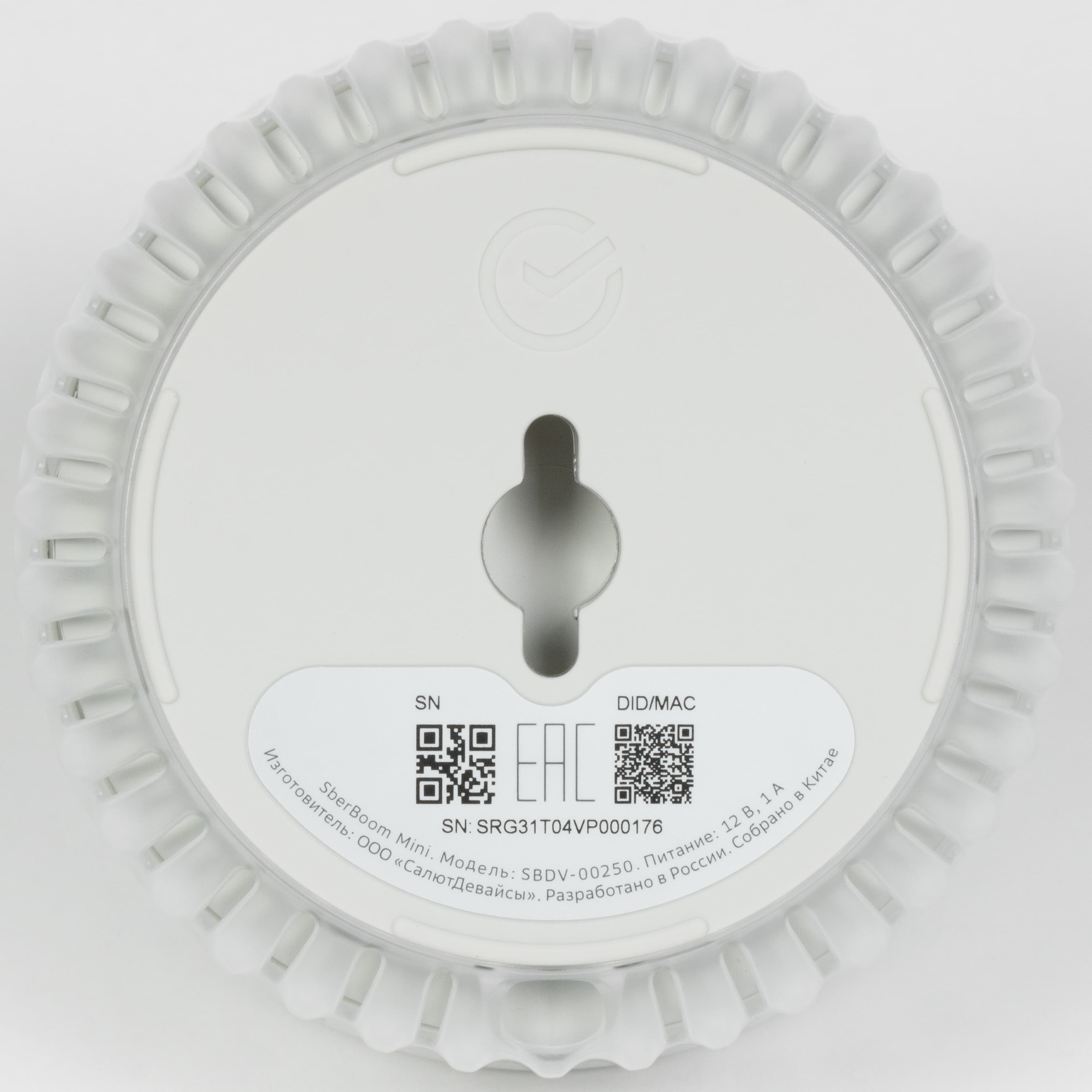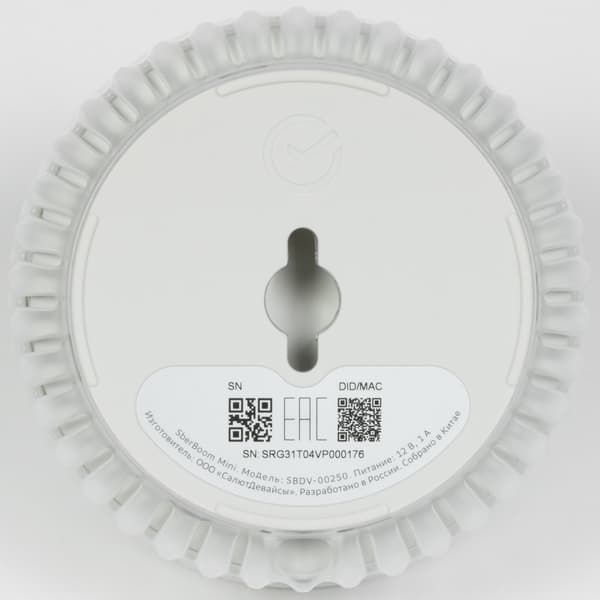 Сзади размещен разъем питания. В обеих версиях SberBoom Mini используется штырьковый разъем, а не USB Type C, как у другой акустики SberBoom. Вновь предположим, что такой выбор связан с возможностью настенного крепления колонки и тем, что она потенциально может часто перемещаться с места на место. Круглый штекер свободно крутится внутри разъема, поэтому кабель меньше подвержен изломам. Это с одной стороны, а с другой — если сделать кабель съемным и стандартным, его в случае повреждения можно просто заменить на новый. Так что решение по-прежнему спорное.