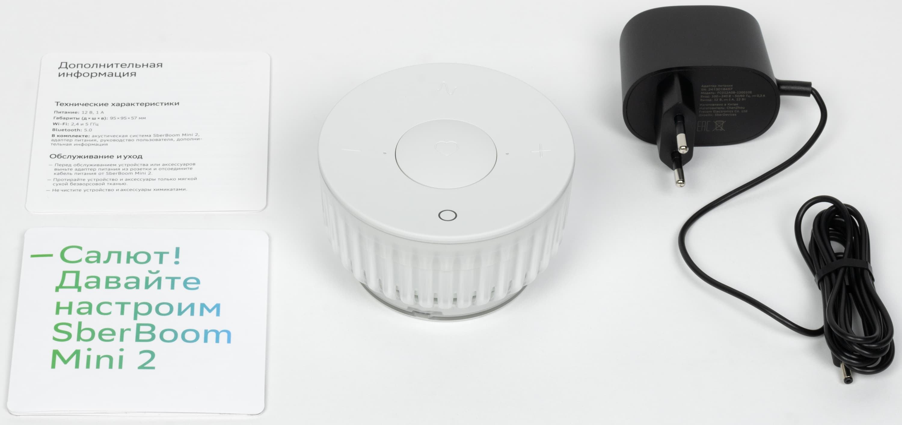 В комплект поставки входят сама SberBoom Mini 2, блок питания и документация. Также при ее активации можно получить подписку «СберПрайм» за символическую плату в один рубль.