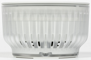 По бокам — ничего особо интересного, просто ребристая прозрачная накладка, за которой в одном месте видно нанесенное на внутреннюю часть корпуса название устройства. Раз есть появился прозрачный элемент — неплохо бы изнутри его чем-нибудь подсветить, но этого пока не сделано. Возможно, подсветку мы увидим в третьей версии колонки — не все сразу. В нижней части размещены отверстия, через которые выходит звук от направленного вниз динамика.