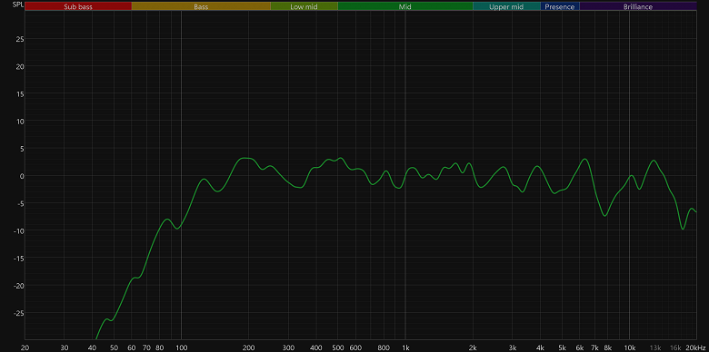 Далее графики усредняются, давая нам общую картину. Для маленькой колонки SberBoom Mini 2 звучит на удивление неплохо: обеспечивает ровную и приятную середину, более-менее читаемый ВЧ-диапазон, даже в область баса аккуратненько заходит, причем воспроизводит низкие частоты пусть и не очень эффектно, зато без лишних искажений и неприятного «гудения».
