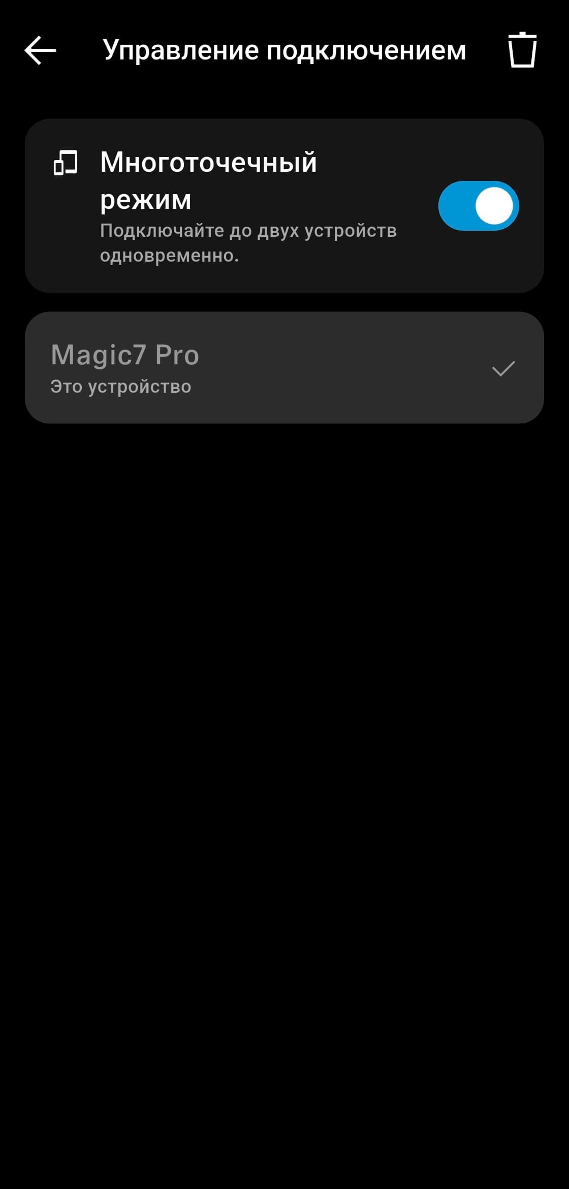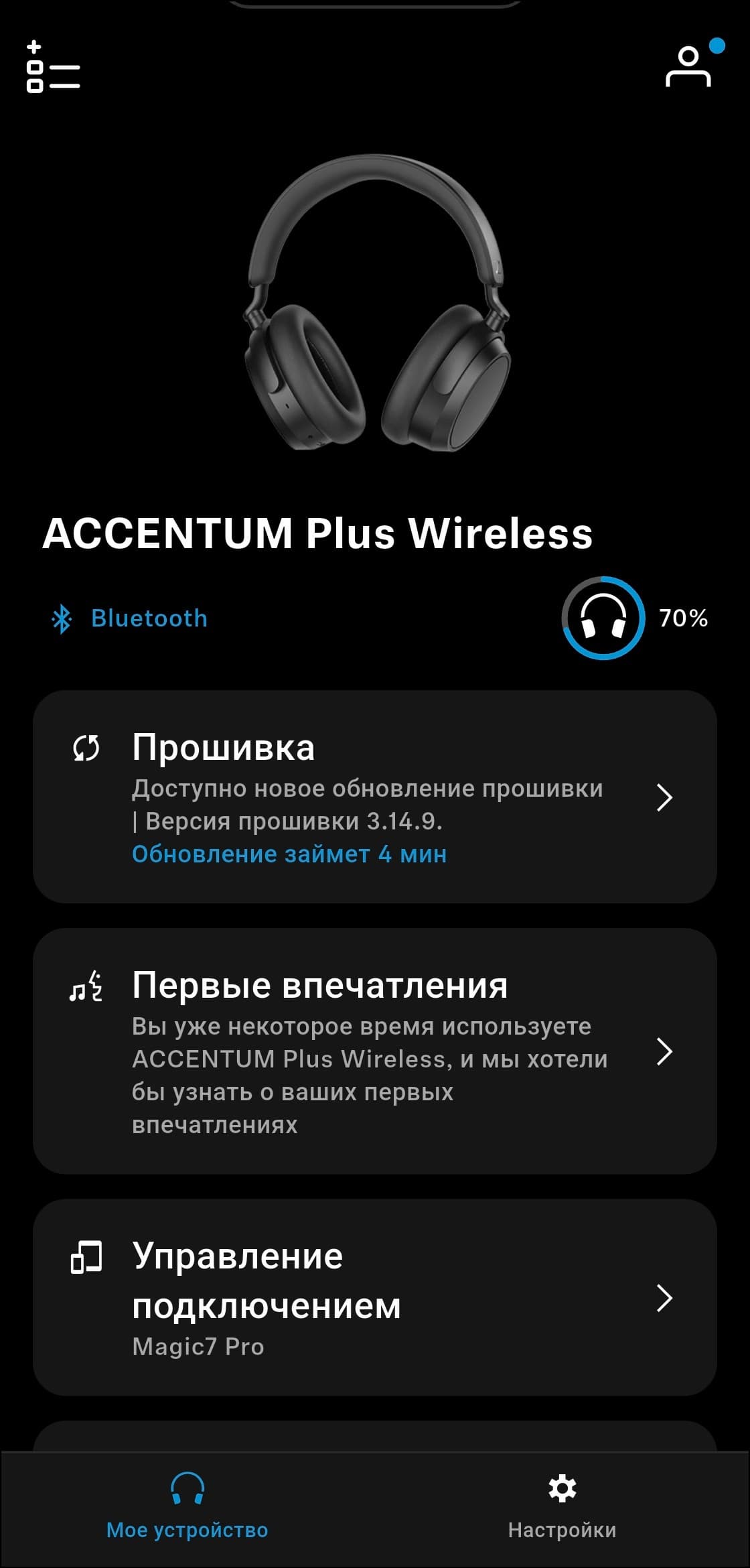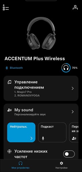 После завершения первоначальной настройки приложение переходит на главный экран. В верхней его части отображается изображение наушников, ниже — активный тип подключения и уровень заряда. Следующий блок отвечает за управление мультипойнтом: одновременно наушники могут быть подключены к двум устройствам. Полный список сопряженных устройств доступен на отдельной странице, там можно включать или отключать автоподключение, а также выбирать, какие из них будут активными в данный момент.