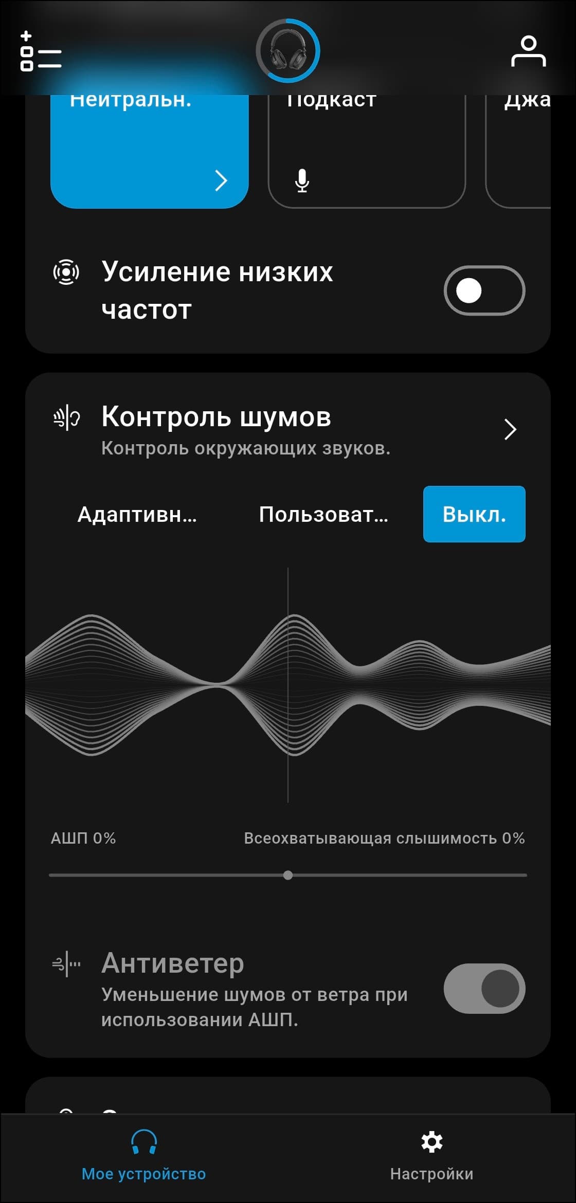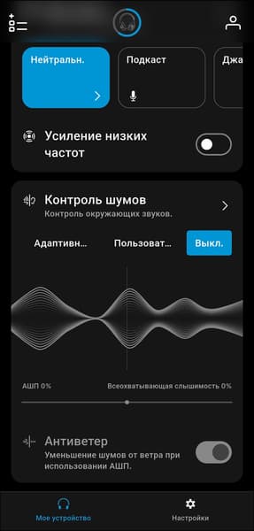Система шумоподавления реализована довольно специфично. Доступны адаптивный режим, при котором гарнитура автоматически подстраивается под обстановку, и плавное ручное переключение между активным шумоподавлением и режимом прозрачности с помощью ползунка в приложении. До ноябрьского обновления 2025 года это были единственные два варианта — возможность полностью отключить шумоподавление отсутствовала, что вызывало заметное недовольство пользователей.