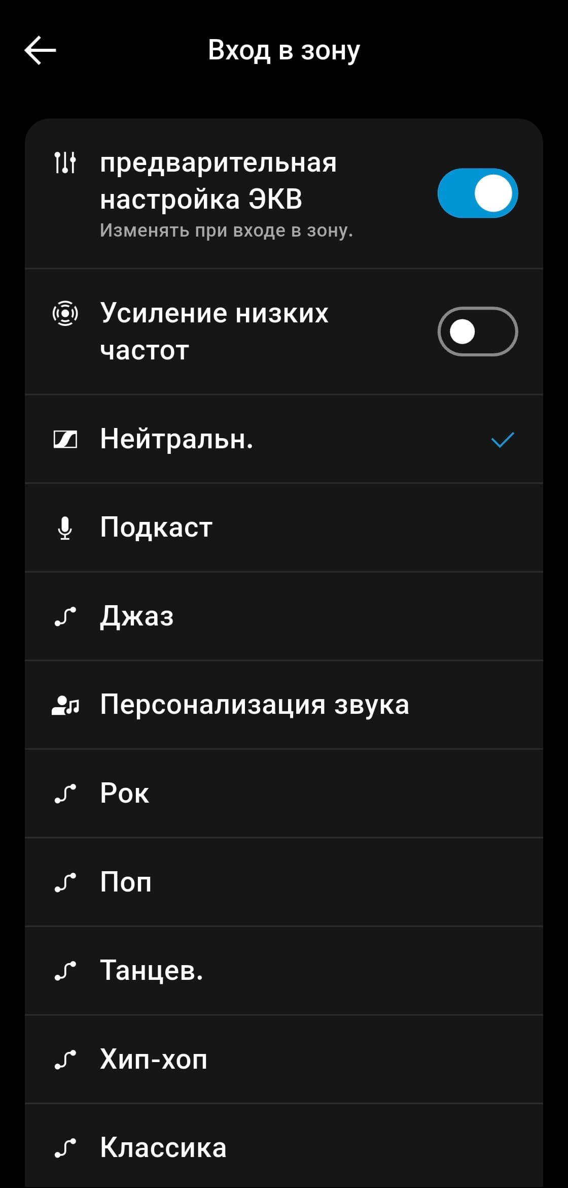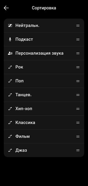 Отдельно включается опция усиления низких частот, которая работает совместно с установленными параметрами эквалайзера. Пресеты удобно сортируются: часто используемые легко поднять вверх списка. Кроме того, при наличии аккаунта и авторизации, о которых мы упоминали выше, настройки синхронизируются с облаком.