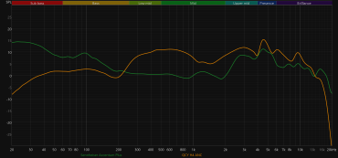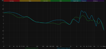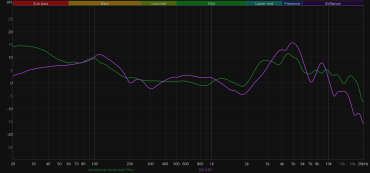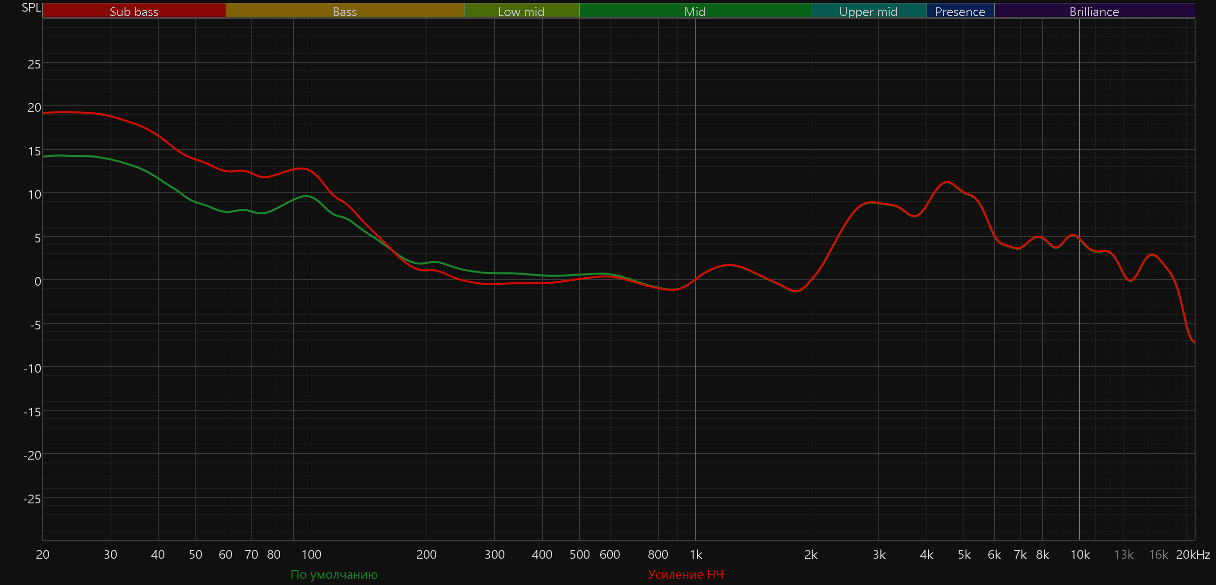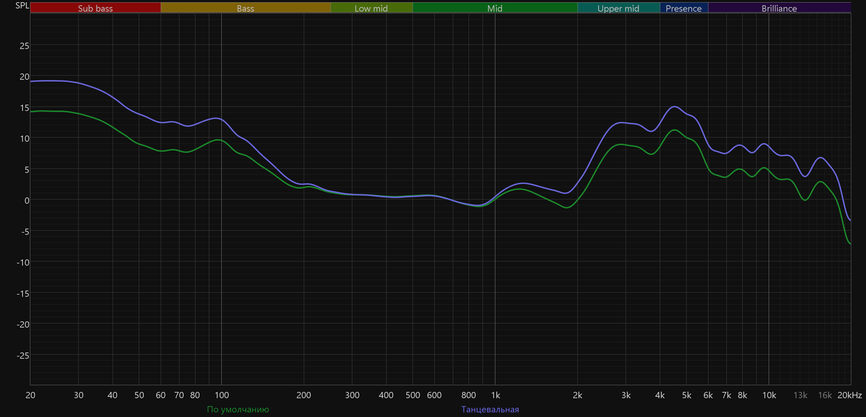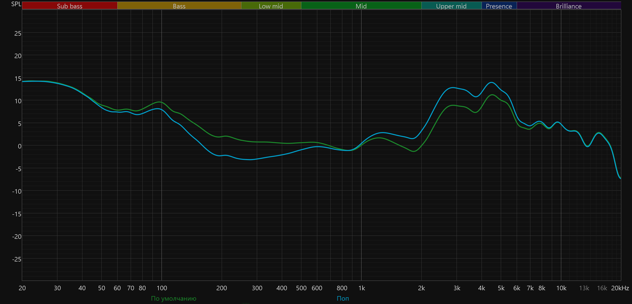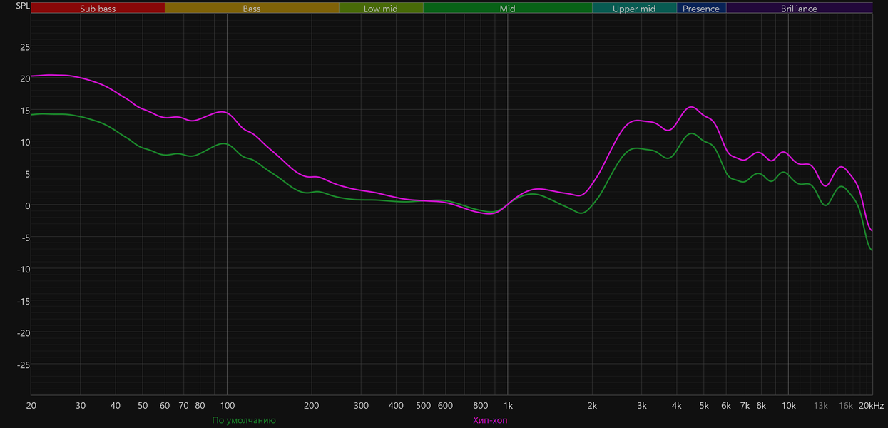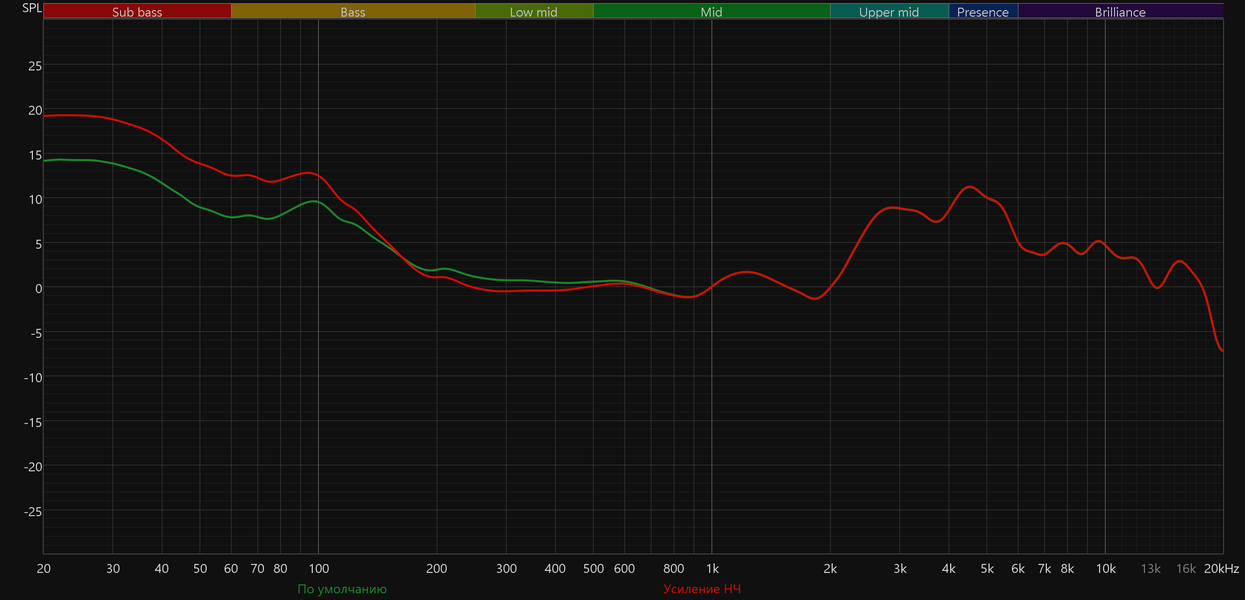 График АЧХ при этом меняется не слишком радикально: акцент в низкочастотном диапазоне сохраняется, но выражен уже не так сильно, а нижняя середина звучит чуть ровнее и комфортнее.