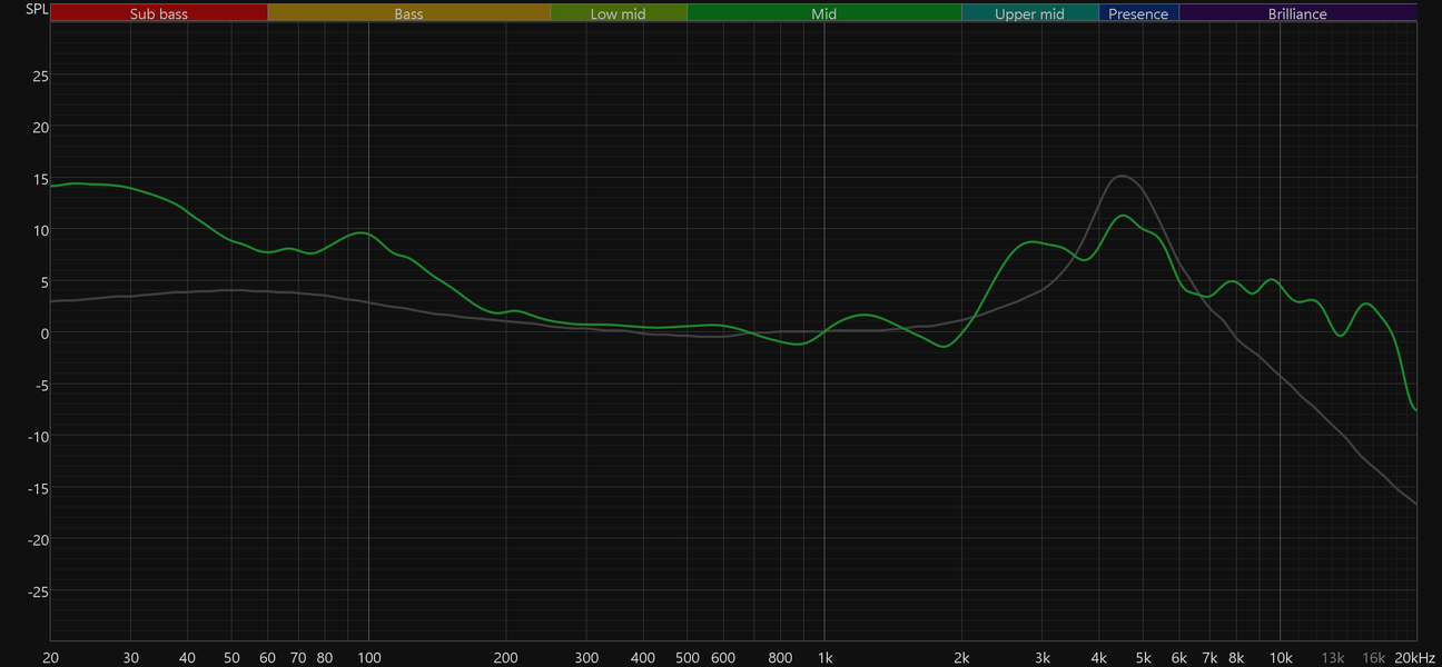 График АЧХ показан на фоне целевой кривой, предоставленной производителем используемого стенда. Она является адаптированным под конкретное устройство аналогом так называемой «кривой Хармана», созданной командой Harman International под руководством доктора Шона Олива. Люди неодинаково воспринимают звук разной частоты, поэтому даже самые точные измерения могут не соответствовать реальному пользовательскому опыту. Для компенсации этих различий и используется целевая АЧХ. Близкое к ней звучание оценивалось сотнями участников экспериментов как нейтральное, сбалансированное, естественное и так далее. Скомпенсируем полученный график АЧХ в соответствии с целевой кривой.