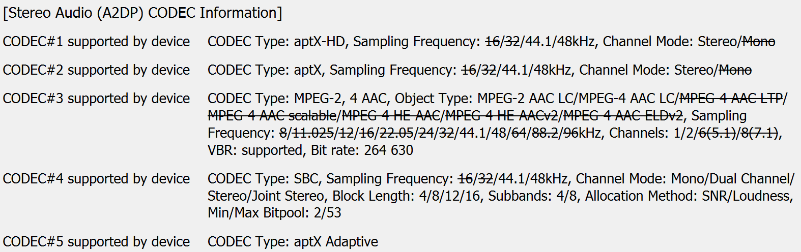 Классические SBC и AAC тоже присутствуют. При этом для SBC максимальное значение параметра Bitpool установлено на уровне 53, тогда как рекомендуемый профиль High Quality предполагает 51. Битрейт AAC ограничен на уровне немного выше типичных для него 256 кбит/с. Так что оба кодека при необходимости будут работать на пределе своих возможностей.
