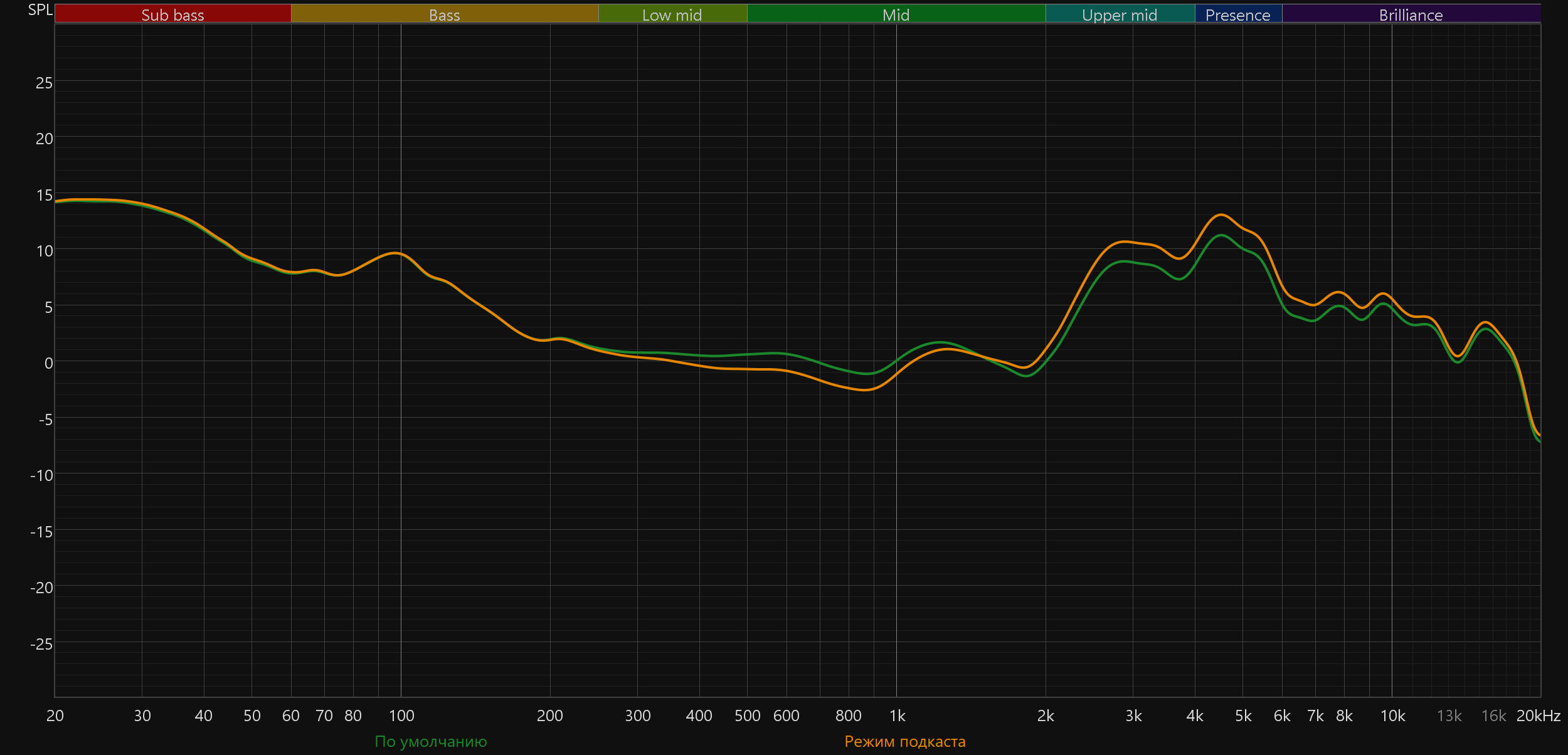 Режим подкаста меняет звучание довольно малозаметно — в основном чуть акцентирует верхнюю середину. На реальном материале изменения более заметны, чем на графике — вероятно, он работает в динамическом режиме.