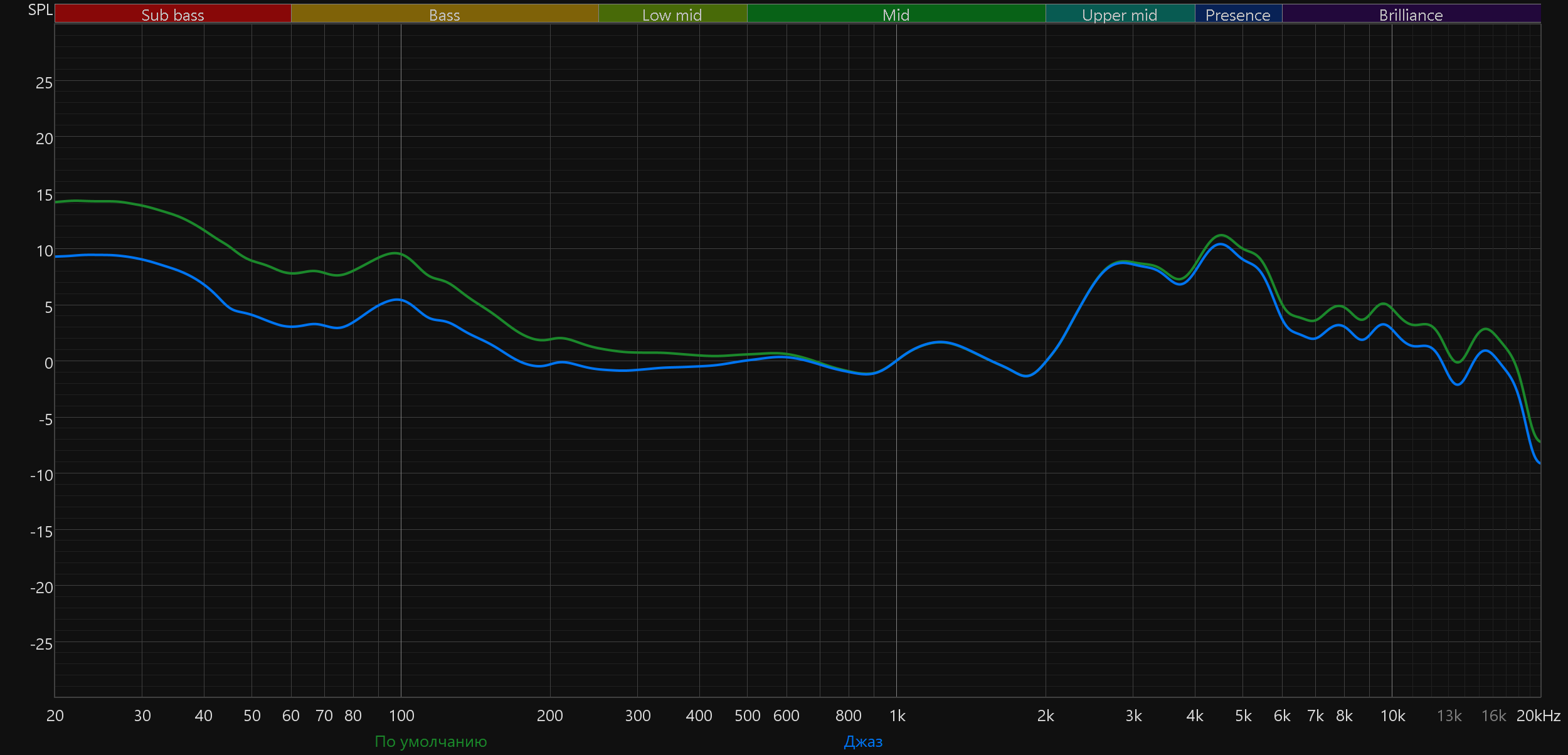 Среди предустановленных эквалайзеров наиболее сбалансированным и универсальным нам показался пресет «Джаз» — он дает ровную и приятную подачу, заметно сглаживая акцент на басах. Остальные варианты в целом соответствуют заявленным жанрам и звучат логично, хотя некоторые решения могут вызывать вопросы. Впрочем, как обычно в подобных случаях, многое зависит от личных предпочтений слушателя.