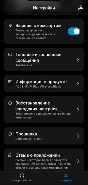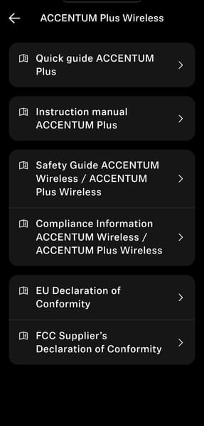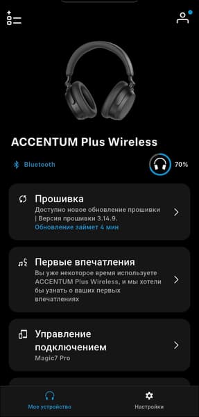 Весной 2025 года Sennheiser выпустила приложение Smart Control Plus — преемника классического Smart Control, развивавшегося с конца 2010-х. При этом старая версия все еще доступна и используется для управления вышедшими ранее моделями. Для работы с Accentum Plus Wireless потребуется именно новая версия, доступная для устройств под управлением как Android, так и iOS. После установки приложение предлагает создать профиль, чтобы можно было синхронизировать настройки через облако.