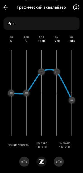 Эквалайзер в приложении предлагает обширный набор пресетов, каждый можно открыть и посмотреть, как именно он устроен. Есть возможность создать и собственный профиль. Как мы покажем ниже, наушники хорошо поддаются эквализации, но эквалайзер в приложении ограничен всего пятью полосами. Для полноценной тонкой настройки этого явно мало, однако для управления ключевыми акцентами — вполне достаточно. А большего в большинстве случаев и не требуется.