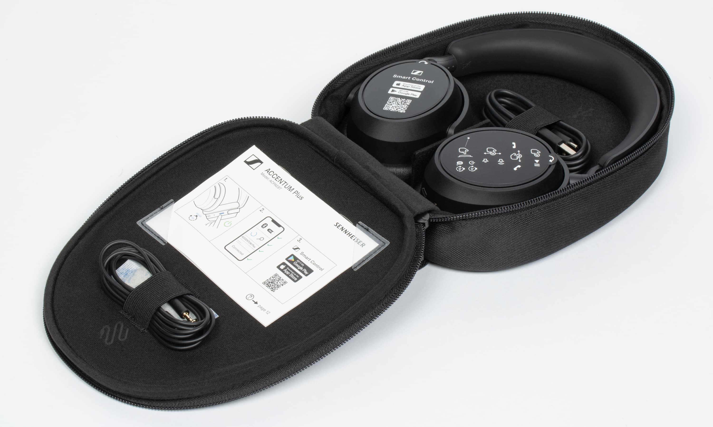 В комплект поставки входят сами наушники, чехол, кабель USB-A — USB-C, аудиокабель для аналогового подключения к источнику звука, а также документация. На внешней панели левой чашки размещена наклейка со ссылкой на загрузку фирменного ПО, на правой — краткая инструкция по управлению с помощью свайпов по сенсорной панели.