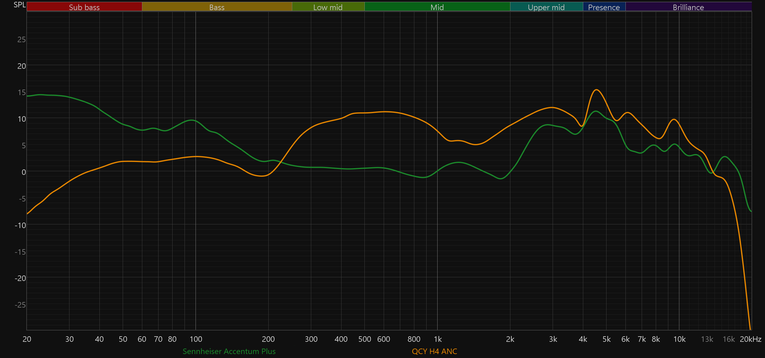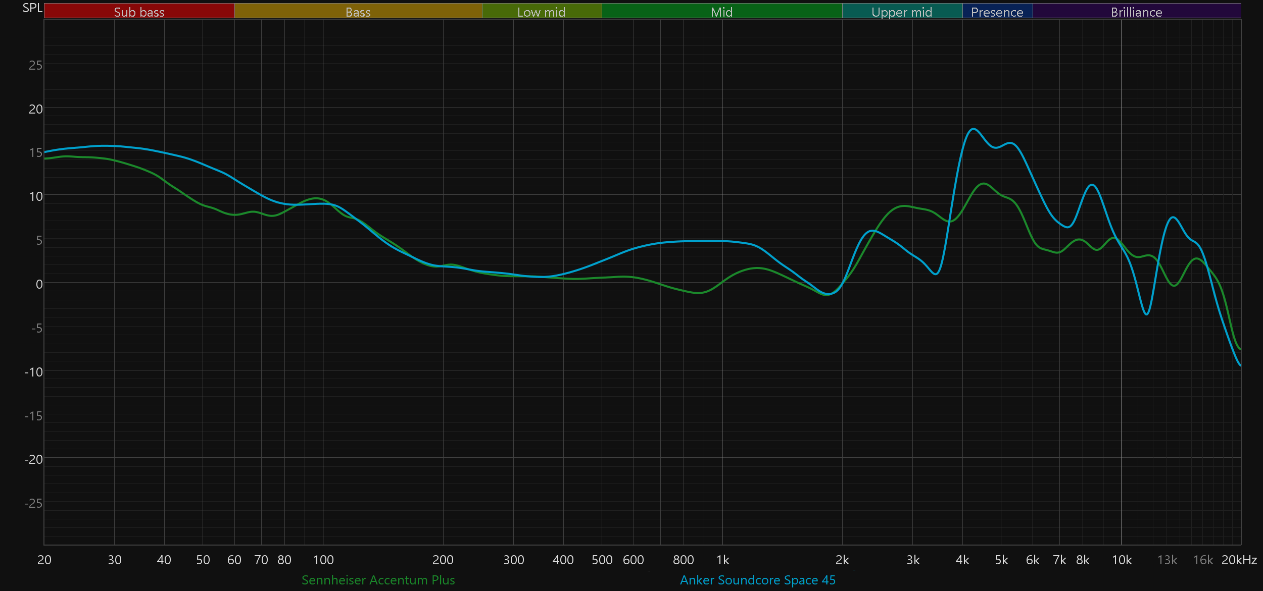 В качестве ответа на вопрос о том, почему для использования в потенциально сложных условиях мы не выбрали более дешевые наушники, сравним звучание Sennheiser Accentum Plus Wireless с рядом популярных бюджетных решений. Наиболее интересным соперником здесь стали Soundcore Space Q45 — мы даже всерьез рассматривали эту модель в качестве альтернативы. Стоит она заметно меньше, выглядит достойно и в эксплуатации вполне приятна, но по качеству звучания ощутимо уступает — и по графику, и, что важнее, по субъективным ощущениям. Тем не менее сбрасывать ее со счетов не стоит. В остальных случаях разрыв очевиден и дополнительных комментариев не требует.