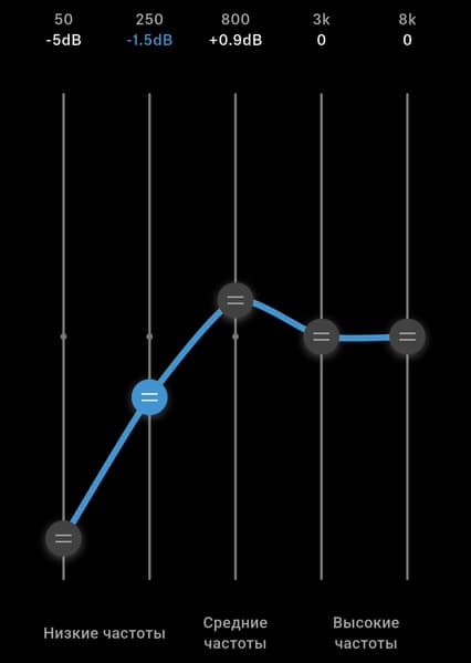 В целом, звучание настроено удачно и не требует серьезного вмешательства. Единственное, с чем может захотеться поэкспериментировать — это акцент на басах. Мы в итоге остановились на следующем варианте настройки эквалайзера: