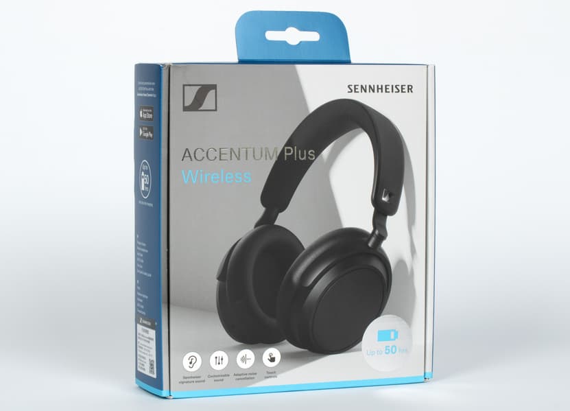 Поставляются Sennheiser Accentum Plus Wireless в коробке из картона средней плотности с откидной крышкой, на которую нанесены логотип производителя, название устройства и его краткие характеристики.