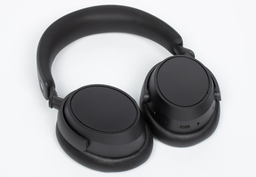 Оголовье не складывается, зато чашки разворачиваются на 180°, благодаря чему наушники помещаются в плоский чехол и удобно размещаются на шее, когда не используются. Внешняя панель правой чашки сенсорная, а вот левая — нет. Чтобы удобно управлять двумя руками, придется купить флагманскую модель — производитель не забывает заставлять «недоплатившего» пользователя немножечко страдать.