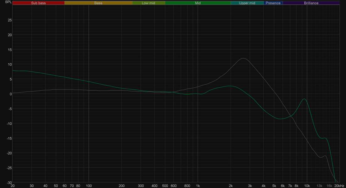 График АЧХ выше показан на фоне кривой IDF (IEM diffuse field compensation), предоставленной производителем используемого стенда. Ее задача — помочь скомпенсировать резонансные явления в имитированном слуховом канале и особенности используемого оборудования, создав «звуковой профиль», максимально корректно иллюстрирующий то, как звучание наушников воспринимается слушателем. Ее можно рассматривать как адаптированный под конкретное устройство аналог так называемой «кривой Хармана», созданной командой Harman International под руководством доктора Шона Олива. Скомпенсируем полученный график АЧХ в соответствии с кривой IDF.