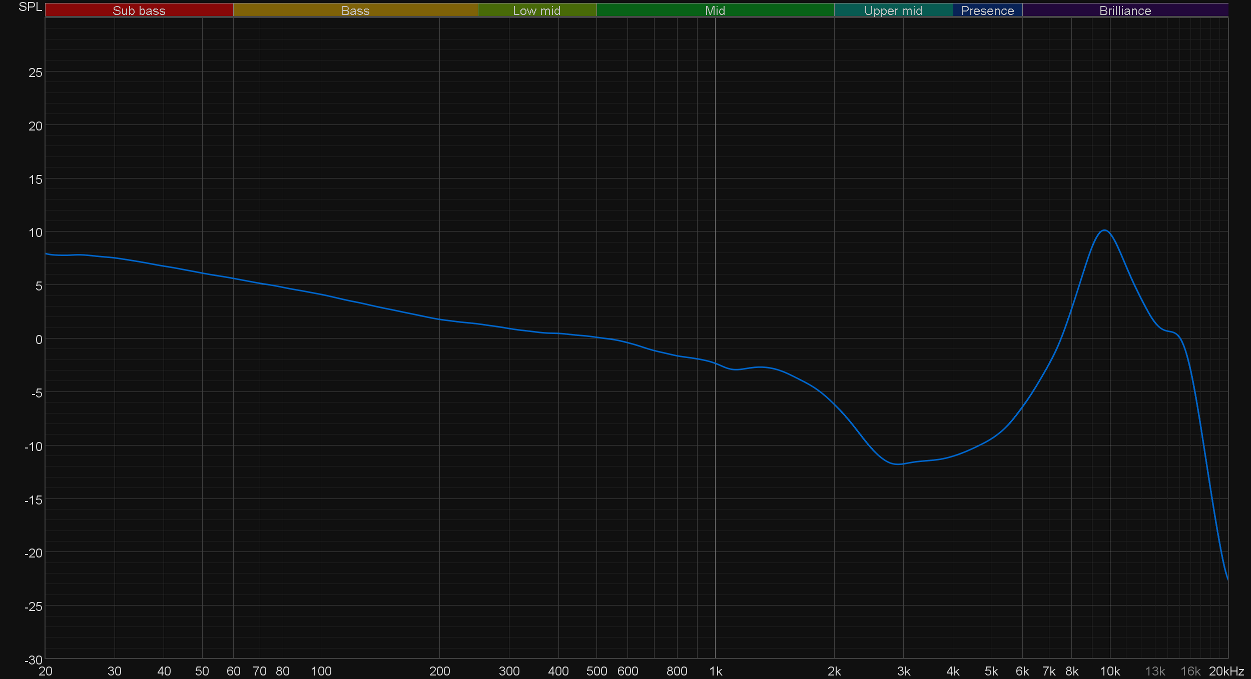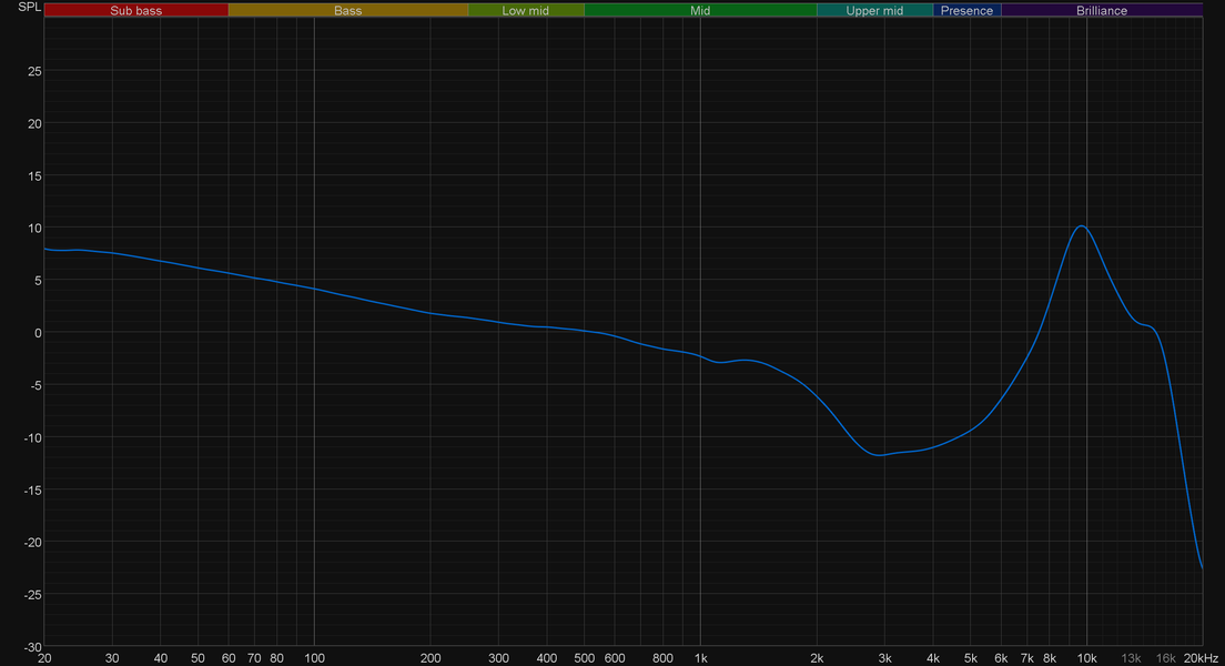 Целевая кривая подразумевает ощутимый пик в районе 2-3 кГц для компенсации резонанса ушного канала. В случае же с тестируемой гарнитурой он оказался не столь ярко выражен, потому на скомпенсированной кривой мы получили видимый провал в этой области. При прослушивании музыки он, конечно же, не так заметен. А вот низкочастотный диапазон, субъективно воспринимается как раз так, как показано на графике — с ощутимым акцентом на басах, который мягко ослабевает по мере продвижения к довольно сдержанно подаваемым средним частотам.