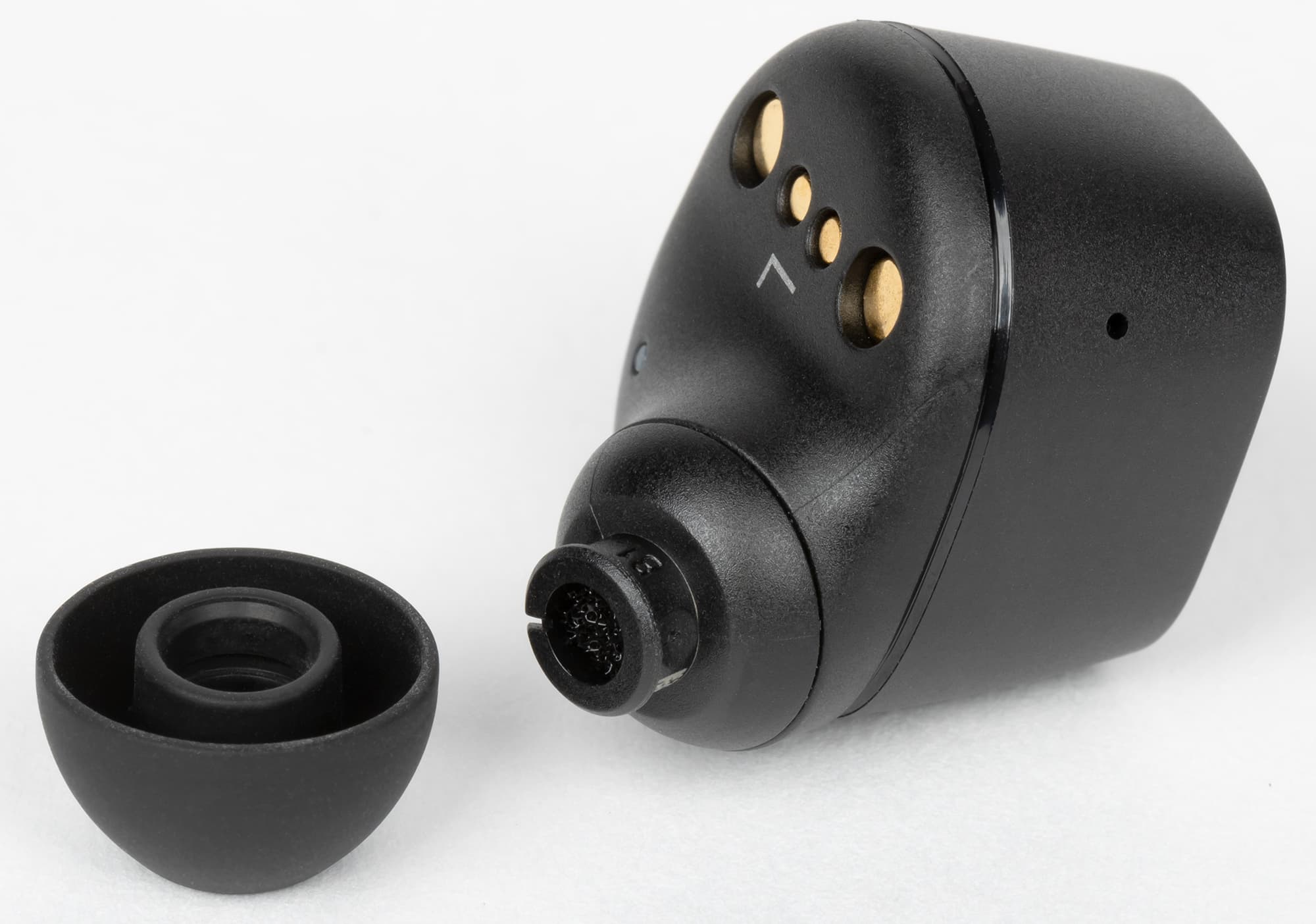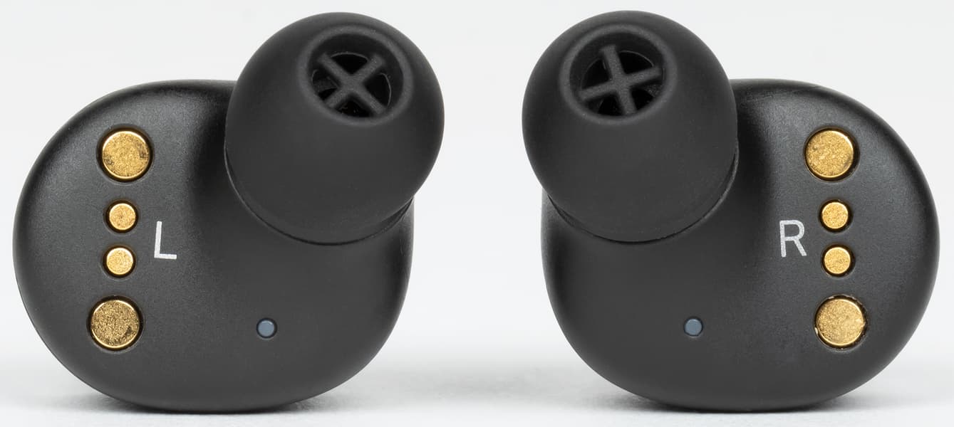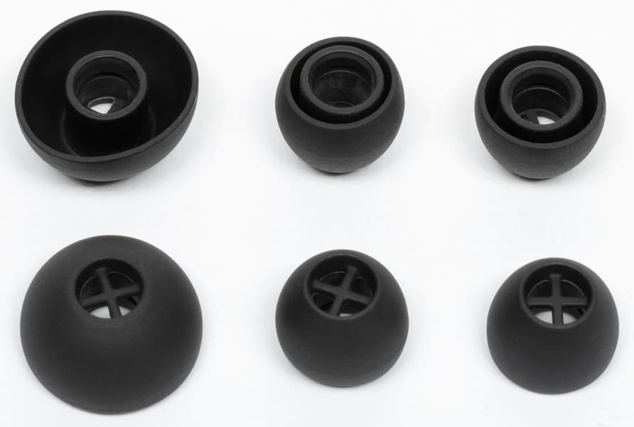 Амбушюров три пары, плюс еще одна установлена изначально. Как и у флагманской модели, внутреннее отверстие закрыто крестообразным элементом, предотвращающим слишком глубокую посадку ушных адаптеров на звуковод и обеспечивающим первоначальную защиту от проникновения у него загрязнений.