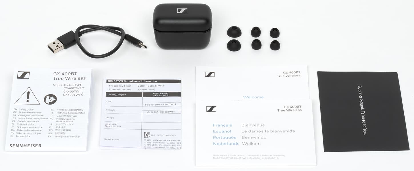 В комплект входит сама CX 400BT True Wireless, зарядный кабель USB — USB Type C длиной 25 см, амбушюры, футляр, документация.