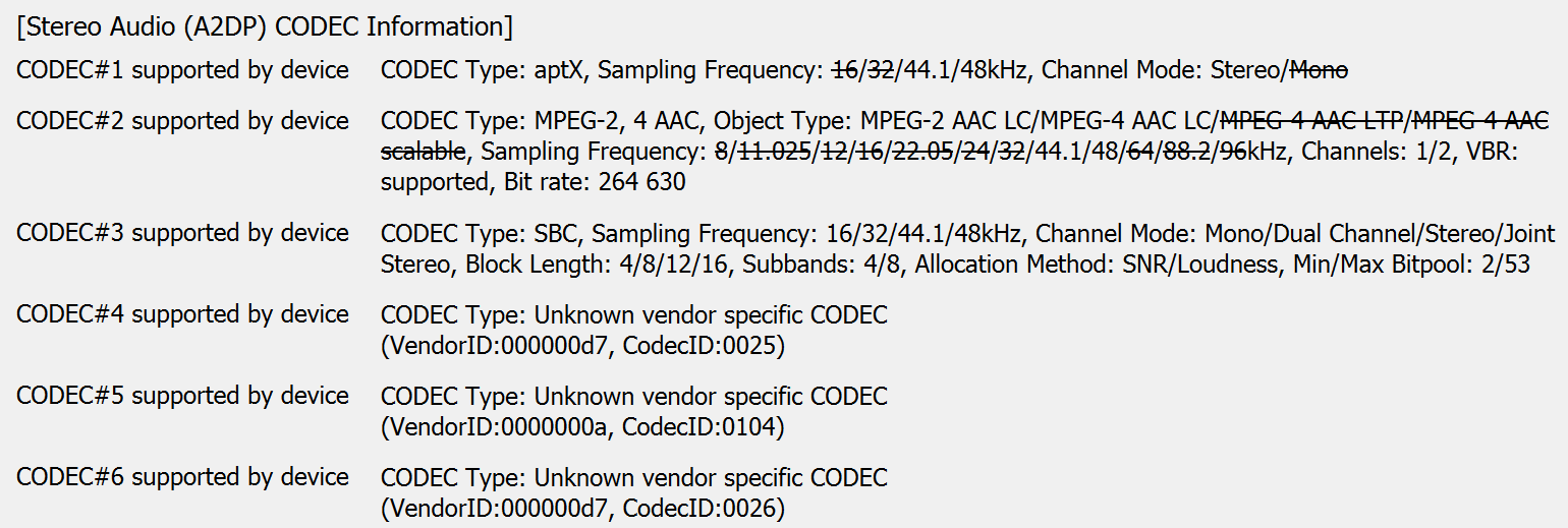 Ведущим является правый наушник, использовать в монорежиме можно только его. Немного странно, ведь даже недорогие гарнитуры умеют сегодня подключать левый наушник как отдельное устройство, чтобы его можно было использовать без правого. С другой стороны, за все время тестирования мы всего пару раз столкнулись с «заиканиями» звука — связь наушников с источником и друг другом просто крайне стабильная. Если ради этого надо пожертвовать монорежимом в левом наушнике, который используется раз в сто лет — да будет так. Ну и традиционно мы получили полный список поддерживаемых кодеков с помощью утилиты Bluetooth Tweaker.