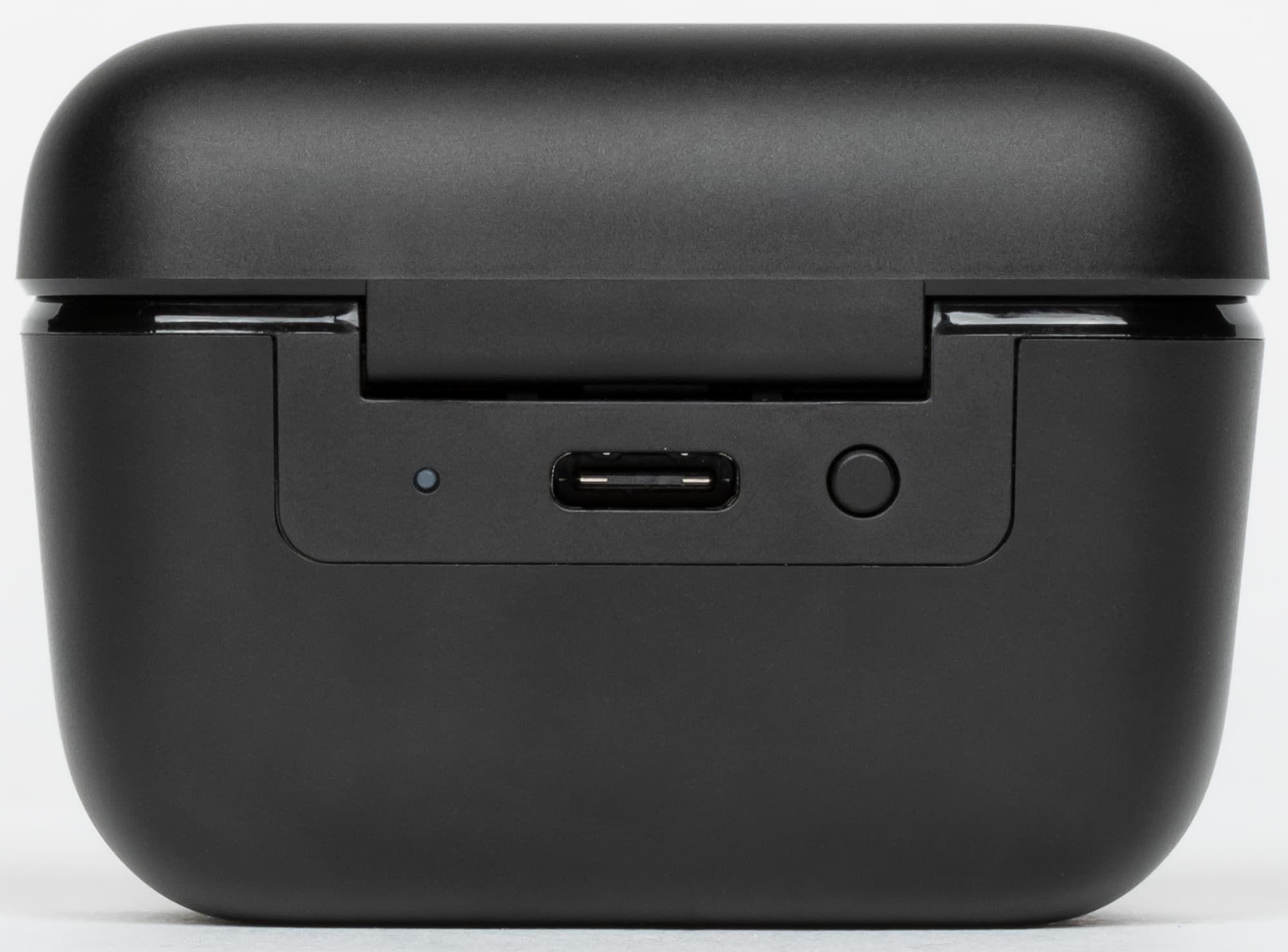 На тыльной стороне корпуса видна петля крышки. Ниже нее размещены порт USB Type C для зарядки, светодиодный индикатор состояния аккумулятора и кнопка для его активации.