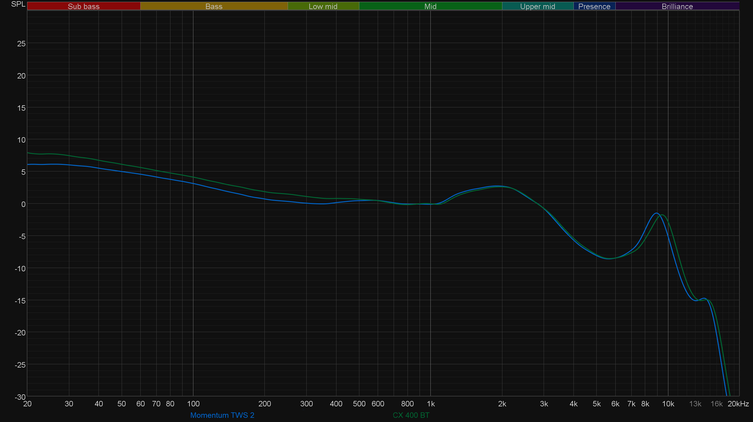 Как уже упоминалось выше, за звук в CX 400BT отвечают те же динамики диаметром 7 мм, что и в Momentum True Wireless 2 — производитель обещает совершенно то же самое звучание, что и в старшей модели. Стоит проверить это утверждение и сравнить графики АЧХ — с этого и начнем.