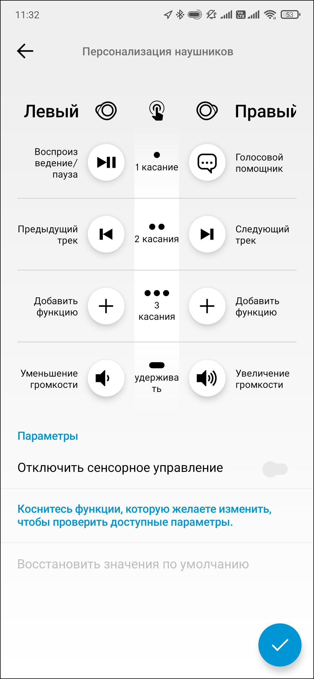 Кроме того, раздел с настройками позволяет включить автоприем вызовов, сделать выбор между тоновыми и голосовыми оповещениями и так далее. Отдельного упоминания, конечно, достойна возможность переназначения различного рода тапов по сенсорной панели. Нет необходимости привыкать к схеме управления, можно создать свою.