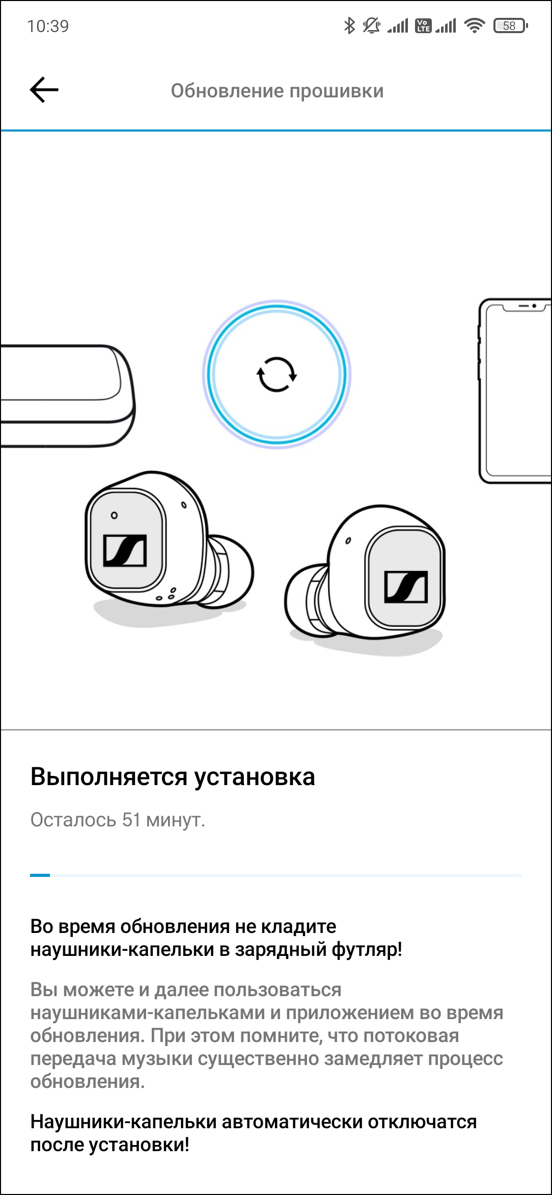 Далее приложение проверяет наличие обновлений встроенного ПО гарнитуры. Если они есть — предлагает установить. Процесс это небыстрый: судя по обратному отсчету на экране, он должен был занять аж 51 минуту. На деле получилось быстрее, но ненамного — уложились в 43 минуты.