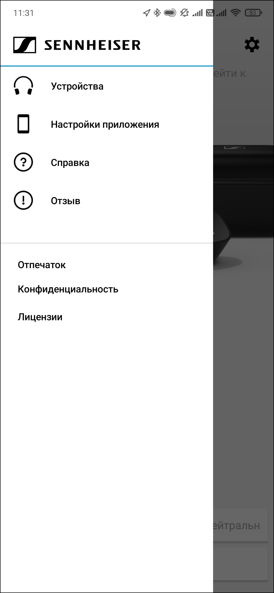 По нажатию иконки в левом верхнем углу появляется меню, в котором можно найти немало полезной информации, а также изменить параметры приложения — в частности, выбрать язык интерфейса. Сразу отметим, что в Smart Control появилась очень интересная и полезная возможность — переключение между источниками. Полноценный мультипойнт она, возможно, и не заменит. Но все равно довольно удобно. В памяти CX 400BT, кстати, сохраняются до восьми ранее подключенных устройств.