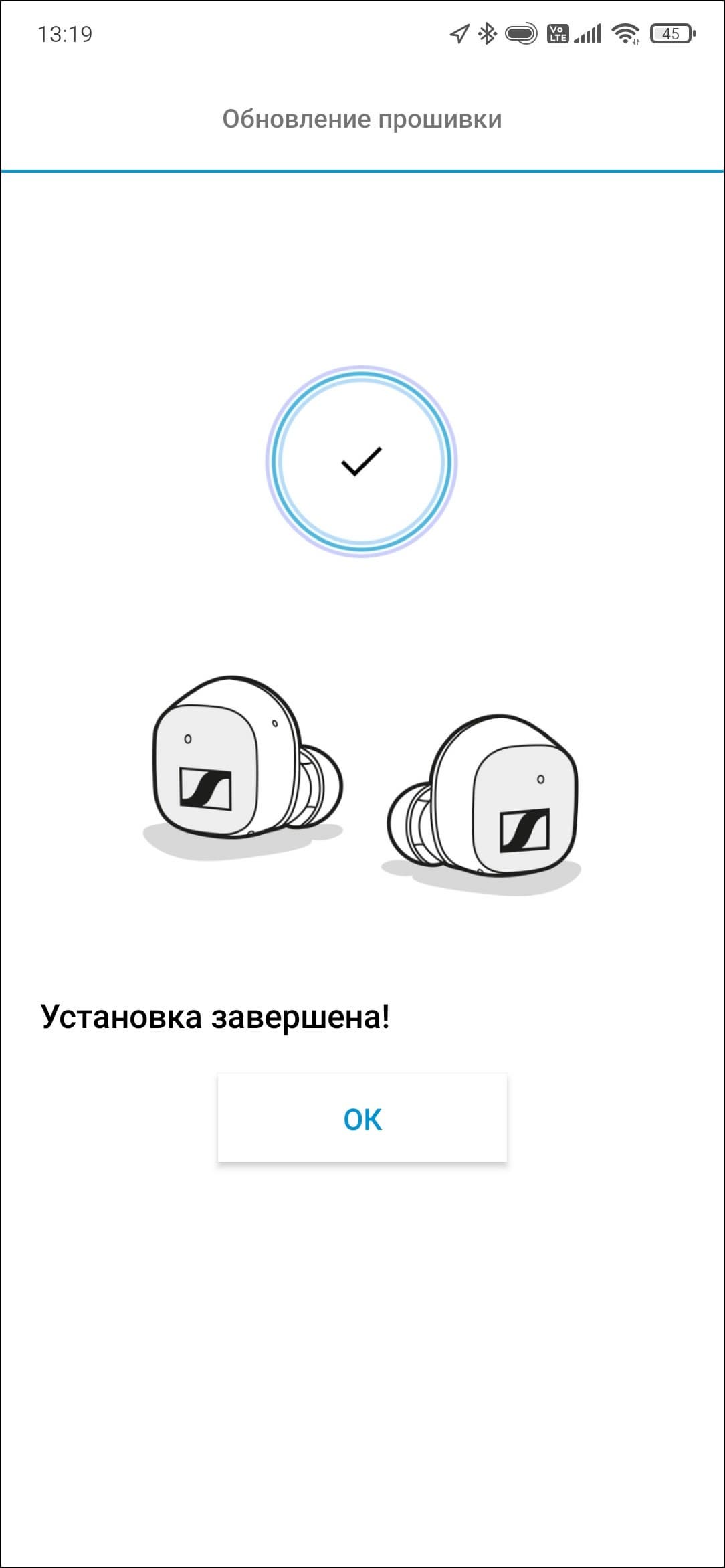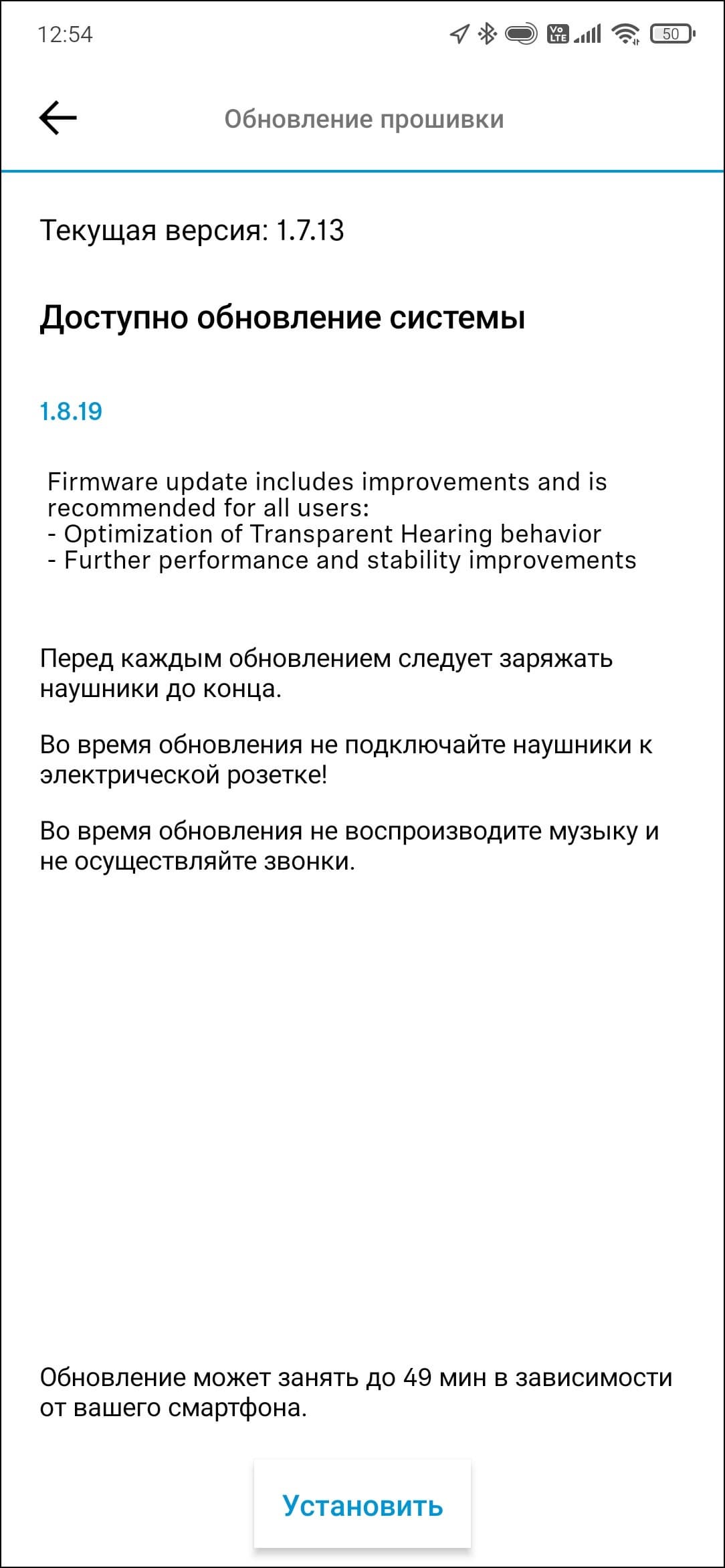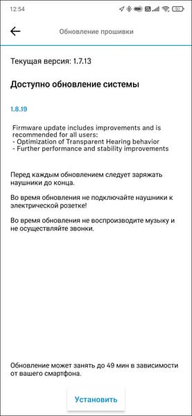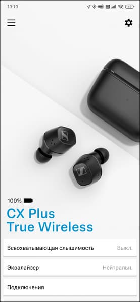 В финале обновления прошивки гарнитура перезагружается, после чего пользователь оказывается на главном экране приложения, где можно увидеть общий статус зарядки — отдельно по каждому наушнику информации нет. Внизу находится переключатель функции Transparent Hearing, название которой переведено как «всеохватывающая слышимость», но мы больше привыкли к термину «звуковая прозрачность». По клику на иконку в правом верхнем углу можно попасть в раздел настроек.