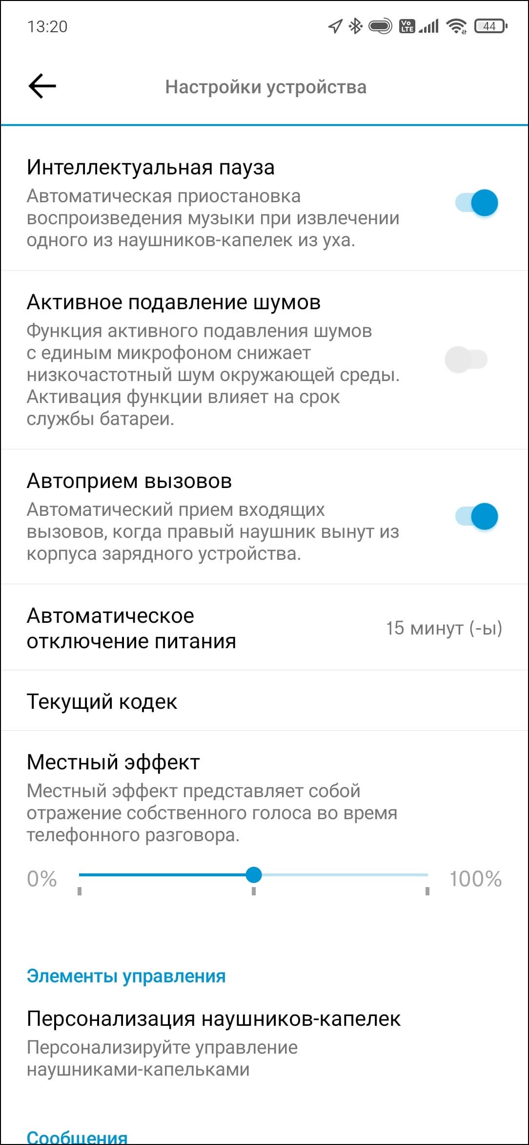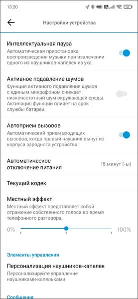 Там можно активировать «умную паузу» при снятии наушников, настроить автоприем вызовов, а также функцию «местных эффект», которая транслирует собственный голос пользователя в наушники во время. Очень странное решение — убрать выключатель активного шумоподавления с главного экрана в меню настроек. Но тут стоит сразу заметить, что работает «шумодав» просто крайне деликатно, необходимости включать и выключать его может особо и не быть.