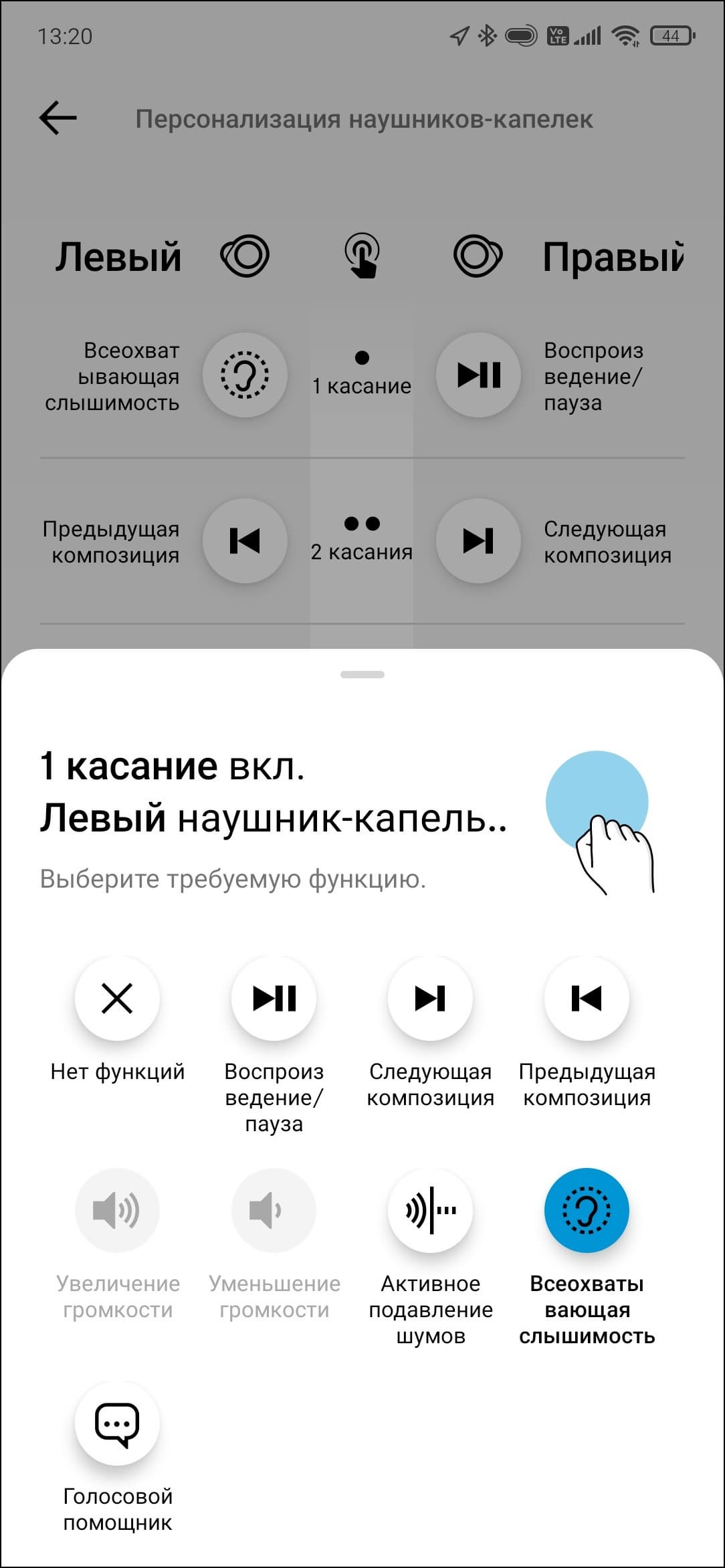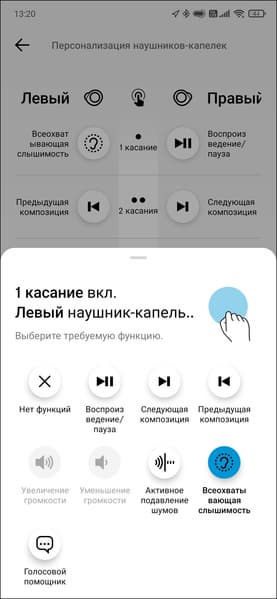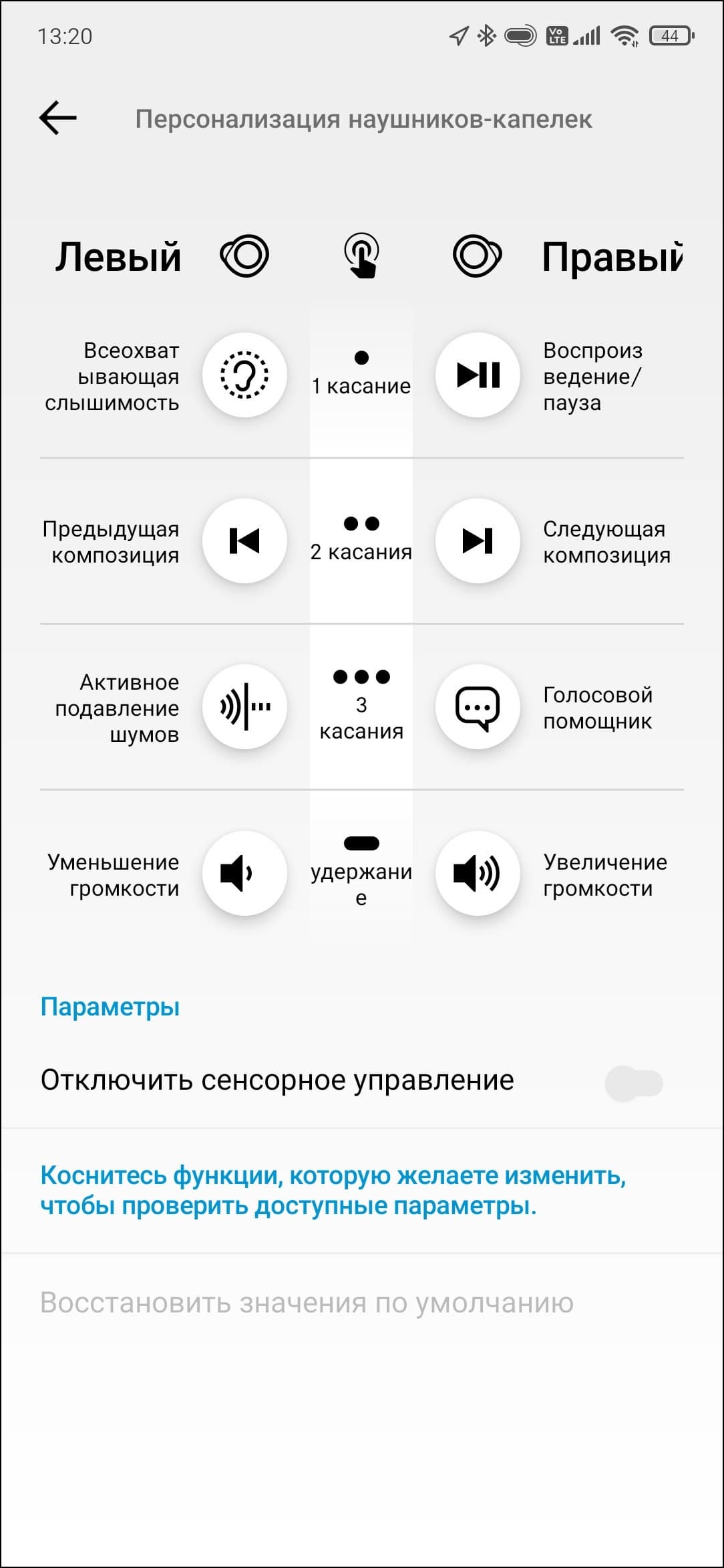 Реакцию наушников на любой из типов касания можно настроить, значения по умолчанию есть на скриншотах ниже. Отдельно, конечно же, радует возможность управления громкостью — в холодное время года это особенно актуально: быстро прикоснуться к наушнику гораздо проще, чем вынимать смартфон из кармана. Действия во время звонка не настраиваются, но там все очень просто: один тап — ответить, два — сбросить звонок.