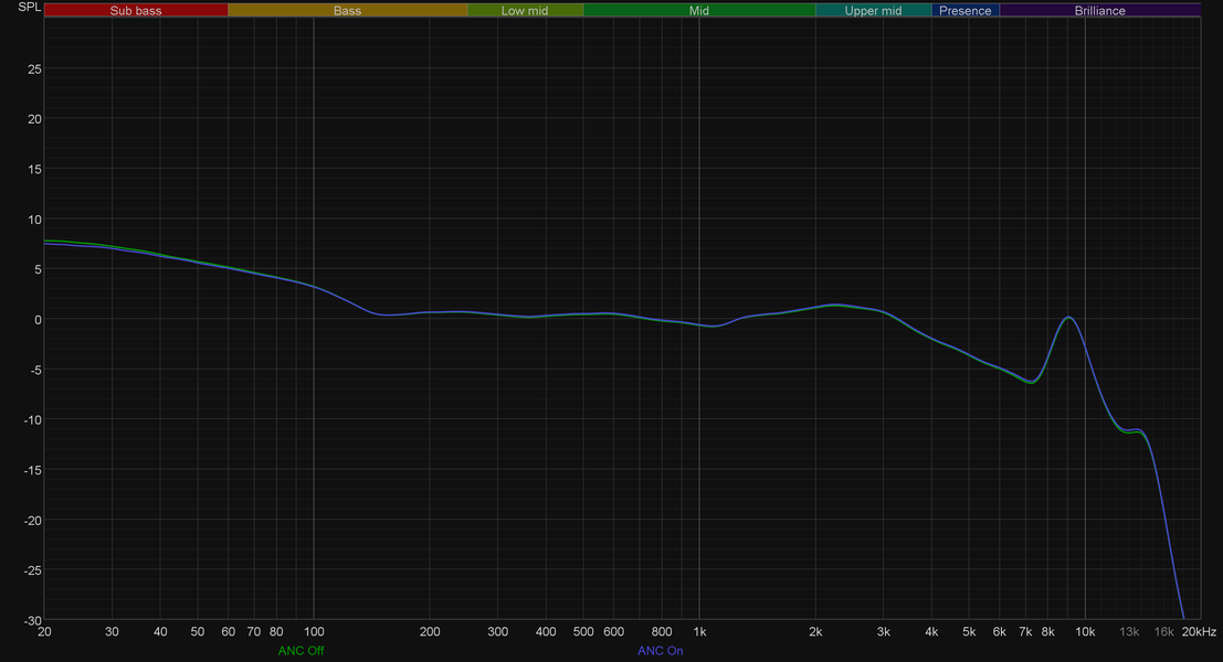 Как видно, в целом звуковой профиль остался прежним. Однако есть и интересный нюанс — верхние частоты в районе 6 кГц немного больше выведены вперед, при этом провал в районе 8 кГц сохранен — видимо, в качестве средства от слишком резкого звучания сибилянтов. Еще пара интересных графиков — с включенным и отключенным активным шумоподавлением. Как видно, его работа не оказывает вот вообще никакого воздействия на звук, что просто замечательно.