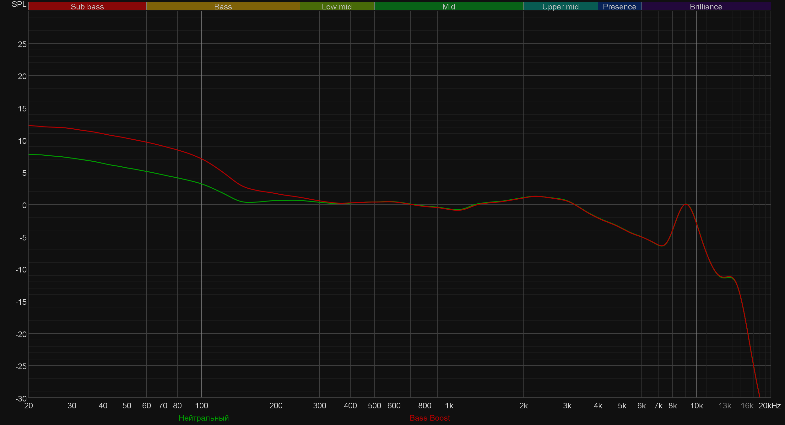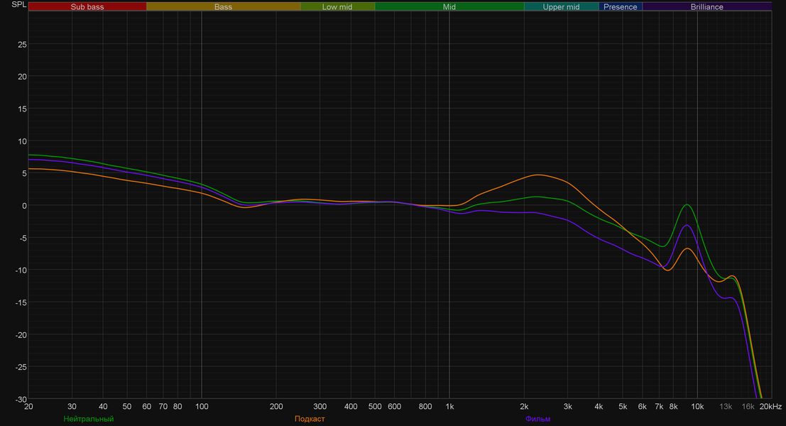 Ну и напоследок посмотрим на работу эквалайзера, для примера взяв готовые пресеты производителя. Видно, что воздействовать можно не только на бас, но и на верхнюю середину, например.