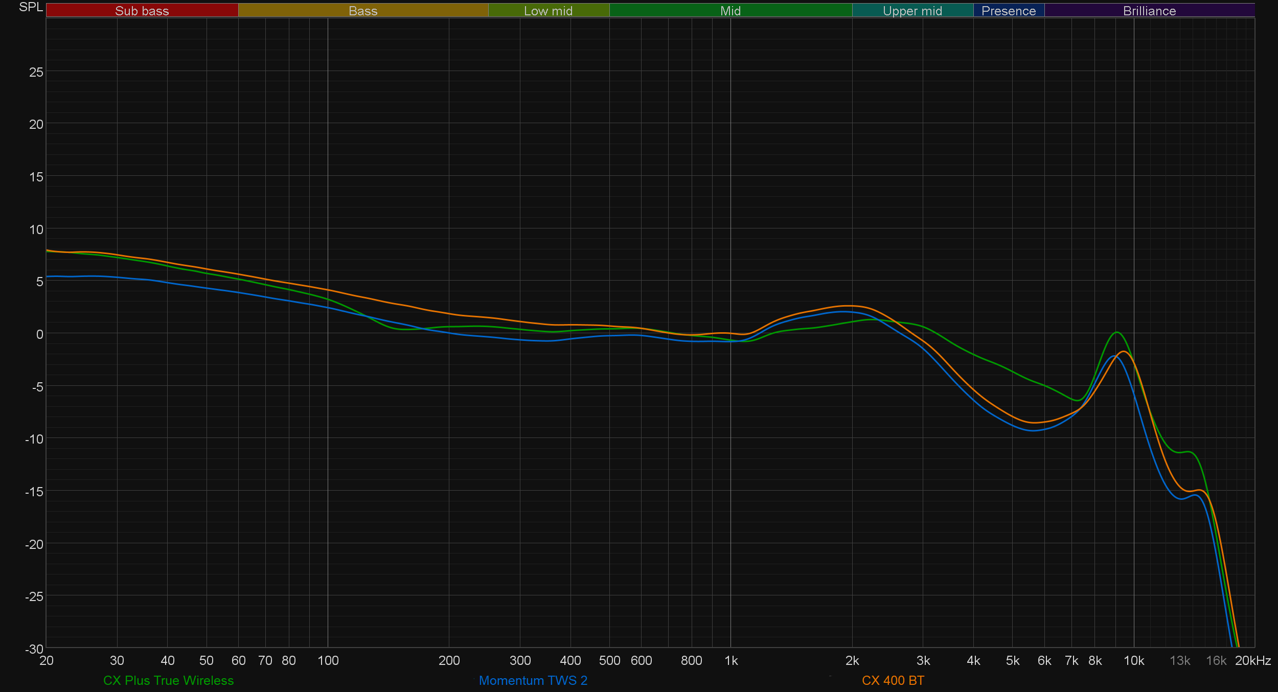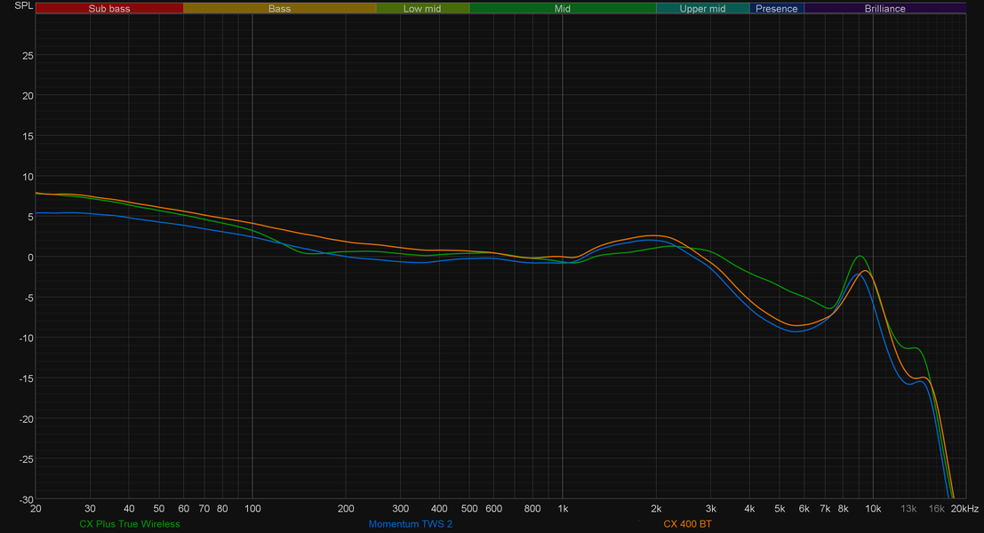 В новое устройство установлен динамик TrueResponse диаметром 7 мм, вероятнее всего — тот же, что и в прошлые. Звучание у CX Plus вполне узнаваемое — «сенхайзеровское». Бас ощутимо акцентирован, но при этом не сваливается в гулкость и «бубнение», звучит с хорошей атакой. Середина проработана и детализирована, но иногда немного уступает «пальму первенства» низкочастотному диапазону. В танцевальной музыке и хип-хопе это часто бывает вполне уместно, а вот в других жанрах может чуть мешать восприятию вокала и партий солирующих инструментов. На этот случай в приложении есть эквалайзер — пусть он и не самый «продвинутый», но сместить акценты в нужную сторону вполне позволяет. В качестве иллюстрации сказанного выше традиционно приведем графики АЧХ.