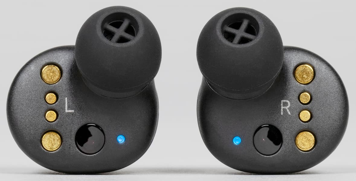 Форма корпуса крайне схожа с CX 400BT, по уровню комфорта ношения они тоже почти неотличимы. Несмотря на среднюю для TWS массу и крупный корпус, наушники отлично держатся в ухе, не доставляют неудобств — все замечательно, если правильно их надевать. А делать это нужно вкручивающим движением, как показано в инструкции. Ну и, конечно, надо подобрать подходящие силиконовые насадки — куда без этого. Благо, в комплекте их аж четыре пары.