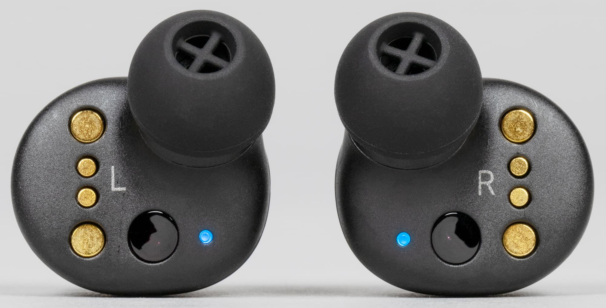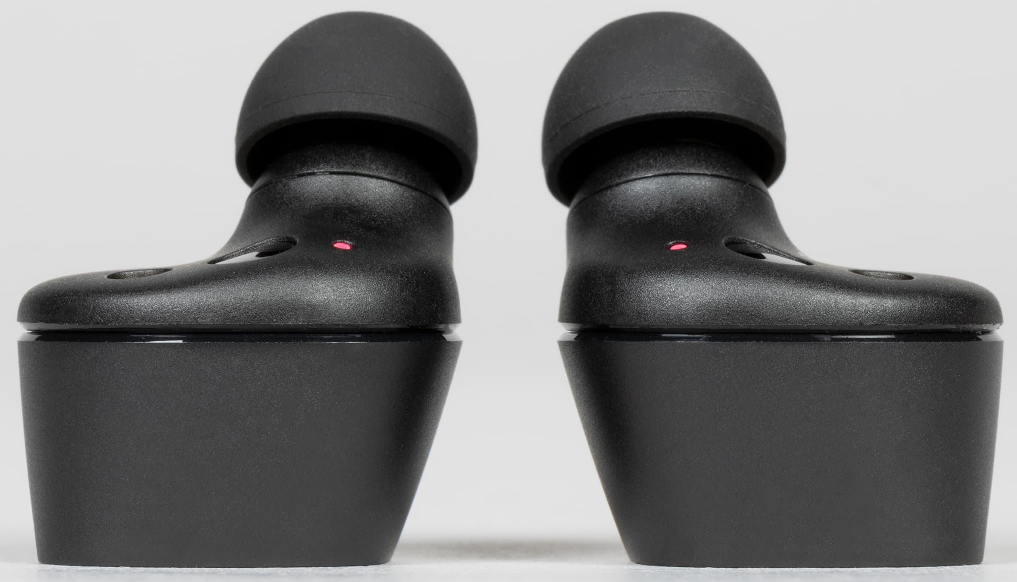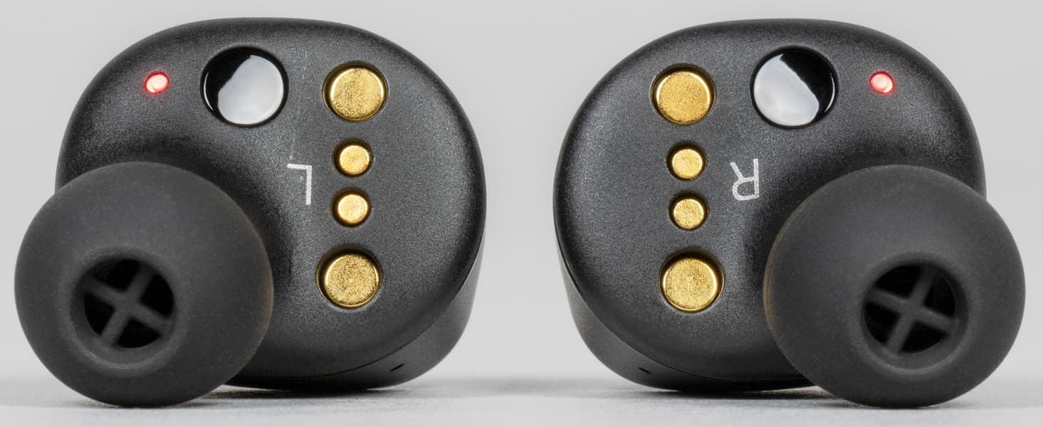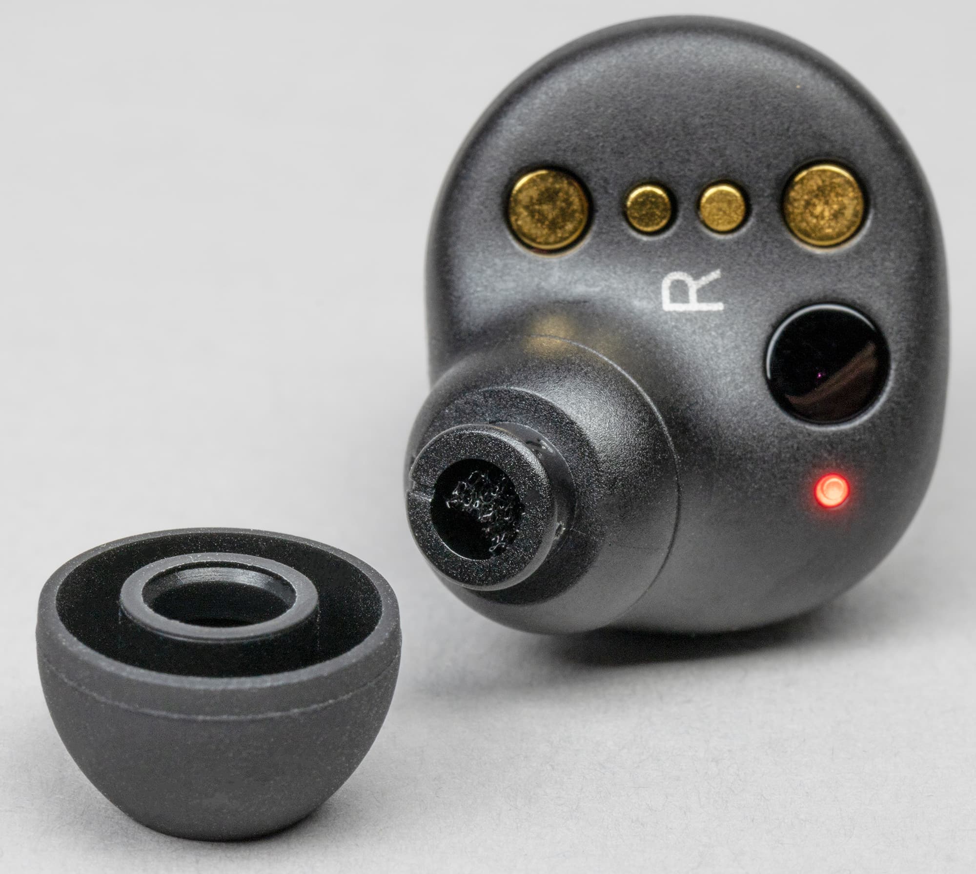 Двухцветный светодиодный индикатор расположен на внутренней стороне корпуса. Отличное решение — и текущий статус можно посмотреть, и никакой заметной окружающим «светомузыки» при ношении гарнитуры. Там же размещены контакты для зарядки и ответные элементы для магнитов в кейсе, обозначения «правый»/«левый» и окошки инфракрасных датчиков ношения.