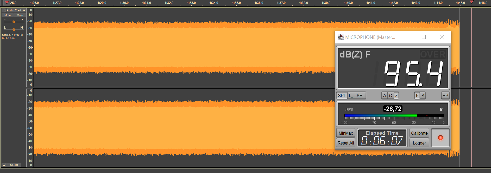 Вот этим-то мы и занялись. Кодек aptX Adaptive, устройство под Android, ну а громкость мы подбираем чуть более сложным образом. Безопасным уровнем звукового давления при прослушивании музыки в наушниках считается 75 дБ, но на практике большинство слушателей предпочитает уровень 90-100 дБ. Мы транслируем в наушники белый шум, фиксируя уровень SPL в районе 95 дБ, сразу после старта воспроизведения запускаем запись сигнала с измерительного стенда — по длине получившегося трека легко понять, сколько проработал каждый из наушников.