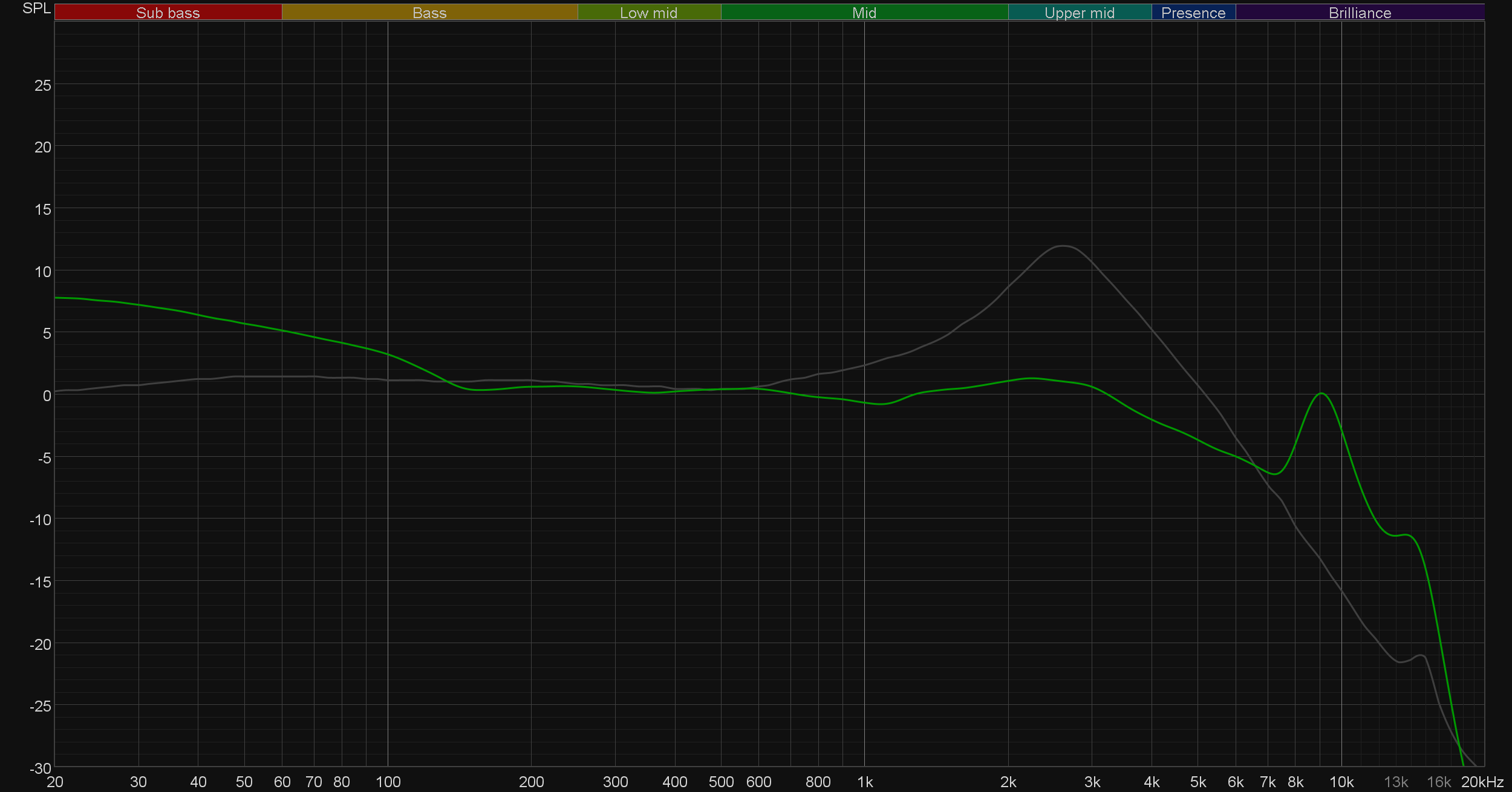 Видны и несколько форсированный низкочастотный диапазон, и вполне «ровная» середина. График АЧХ выше показан на фоне кривой IDF (IEM diffuse field compensation), предоставленной производителем используемого стенда. Ее задача — помочь скомпенсировать резонансные явления в имитированном слуховом канале и особенности используемого оборудования, создав «звуковой профиль», максимально корректно иллюстрирующий то, как звучание наушников воспринимается слушателем. Ее можно рассматривать как адаптированный под конкретное устройство аналог так называемой «кривой Хармана», созданной командой Harman International под руководством доктора Шона Олива. Скомпенсируем полученный график АЧХ в соответствии с кривой IDF.