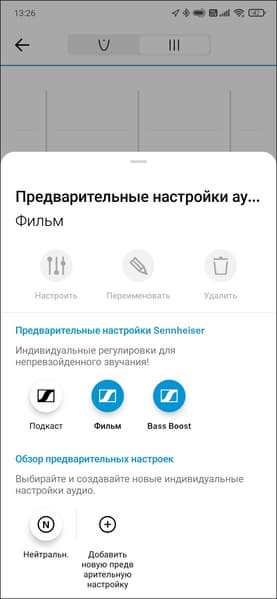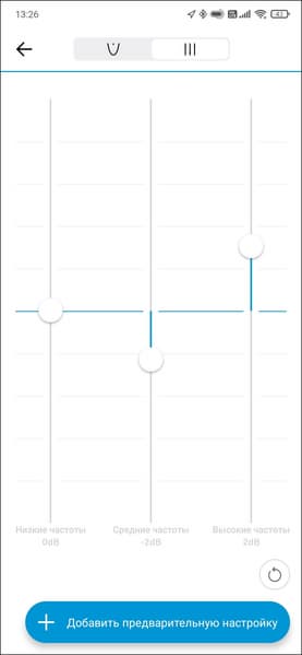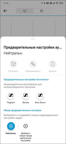Фирменный эквалайзер Sennheiser на месте — изменять звучание гарнитуры можно перемещением точки по экрану. Сначала это кажется не очень удобным, но потом даже начинает нравиться. Также можно переключиться на более «классический» вариант, но полосы всего три — особо не разгуляешься. Пятиполосный мы пока видели только у «аудиофильской» IE 80S BT. Есть парочка встроенных пресетов, плюс функция Bass Boost, возможность сохранения собственных настроек также имеется.
